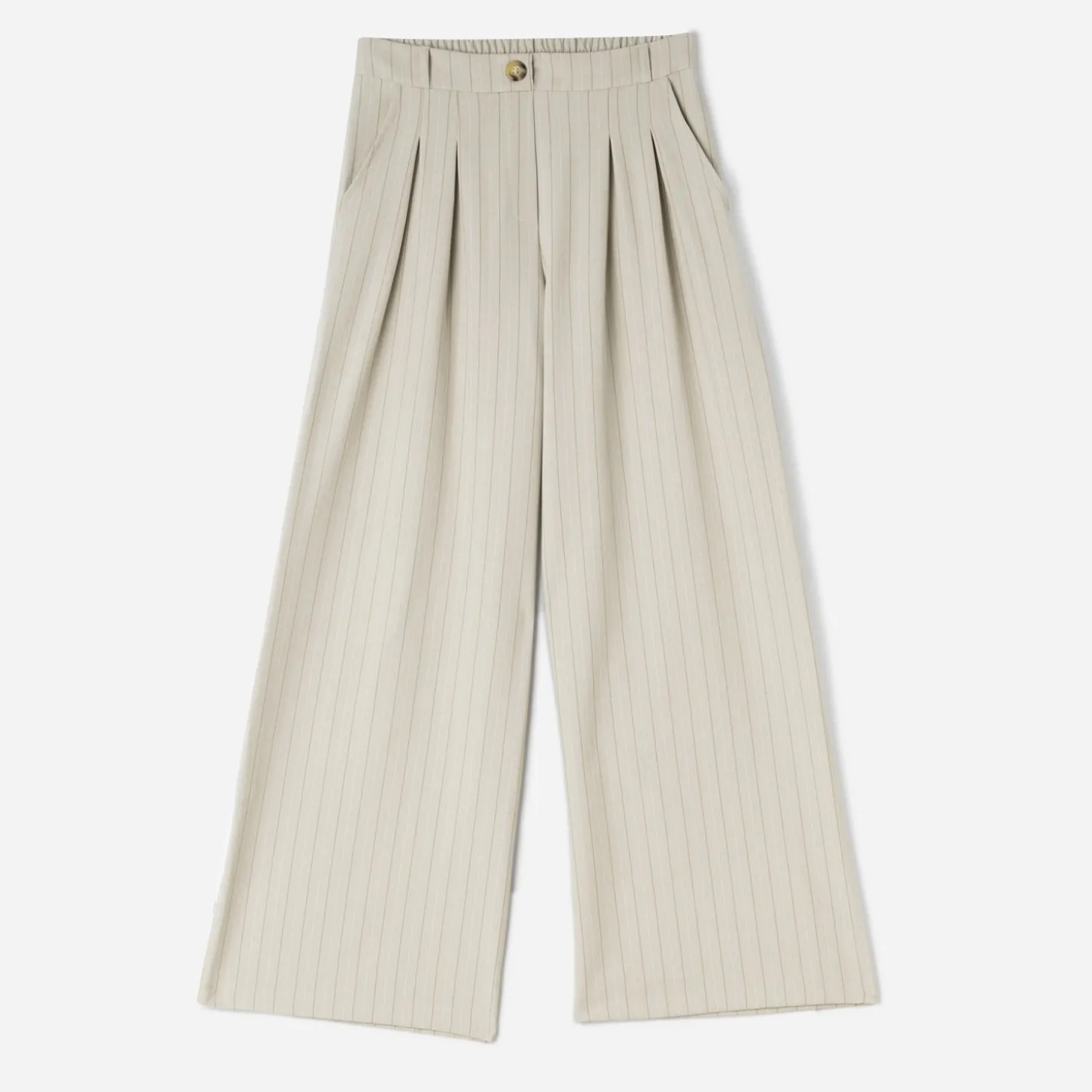 Le pantalon de tailleur, pièce emblématique du vestiaire masculin, connaît une véritable renaissance. Il s’affranchit de son image classique pour devenir un allié de choix dans nos looks de tous les jours. Coupe large au tombé impeccable, motif rayures tennis au style intemporel, il se décline en coloris beige. Un modèle versatile, facile à associer avec le gilet de costume assorti ou un tee-shirt blanc à col rond et manches courtes.