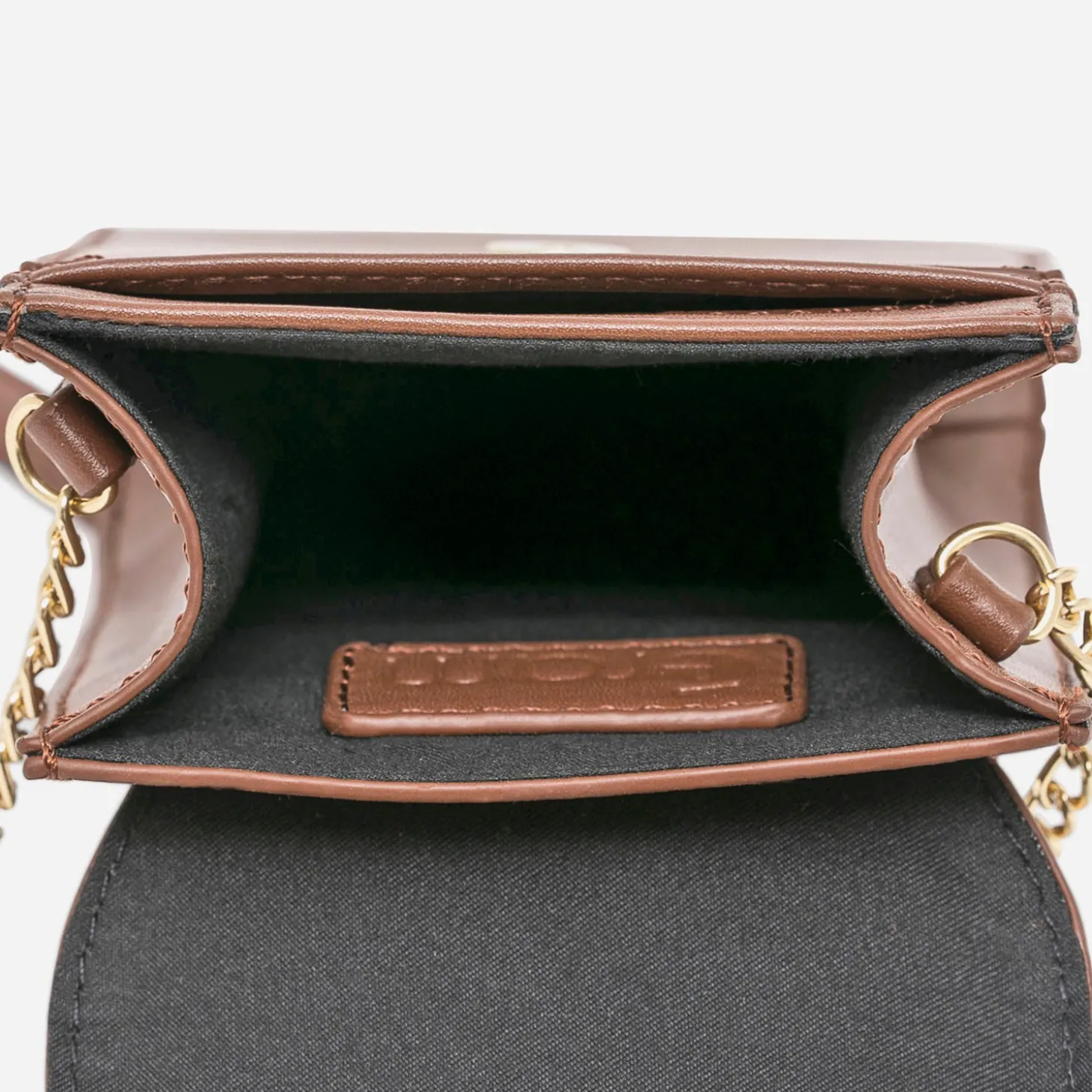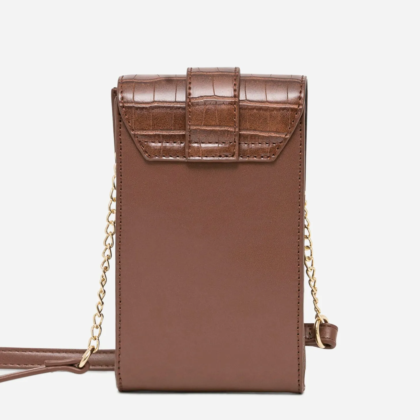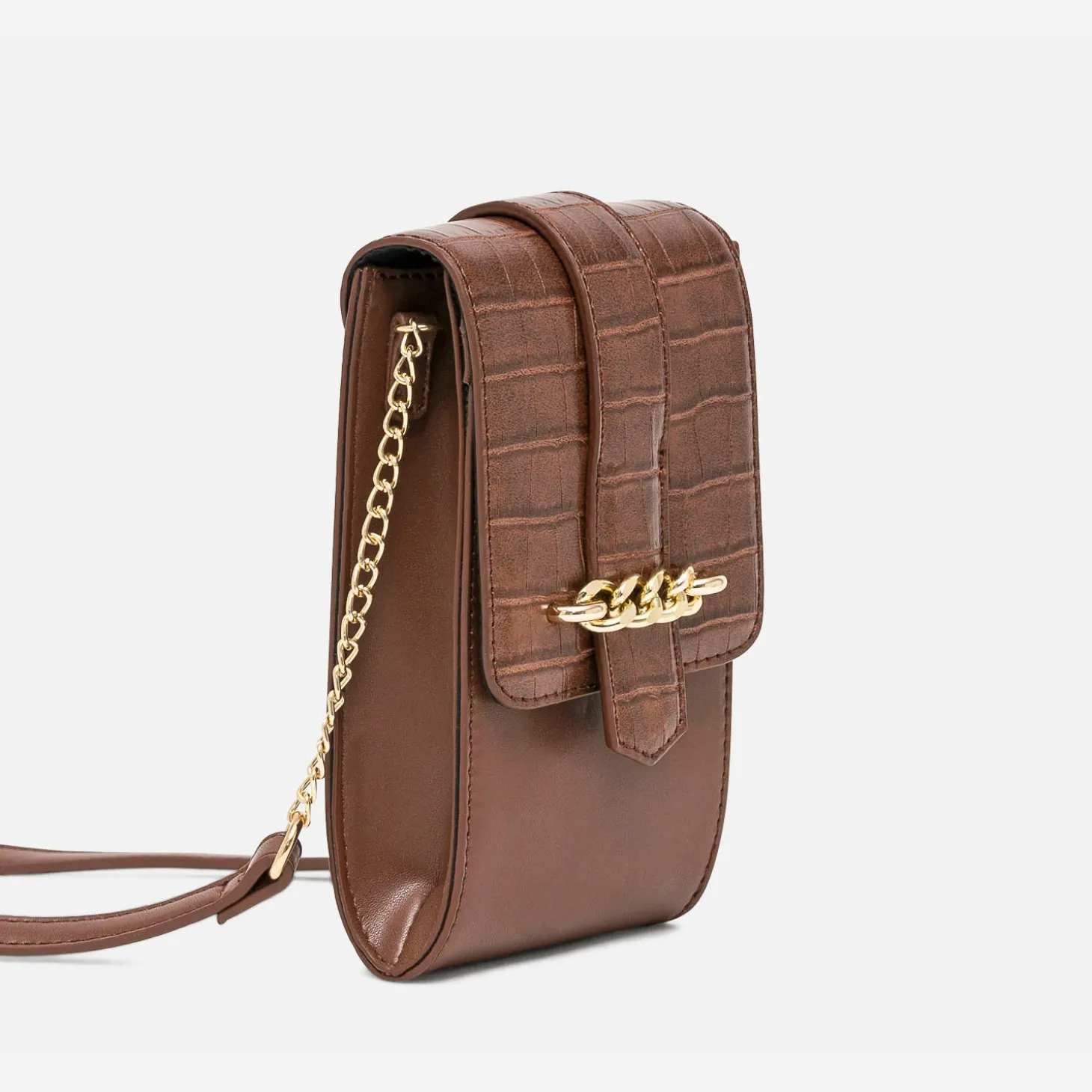 Allégez votre quotidien, en commençant par changer de sac à main. Pensé pour y ranger le téléphone et quelques cartes, cette pochette va vite devenir indispensable. En matière synthétique cognac, elle gagne en style et en chic, par son rabat embossé effet croco et sa patte décorée d’une chaîne en métal doré. Une nouvelle liberté !