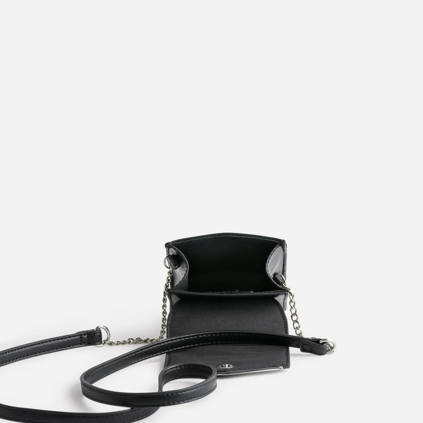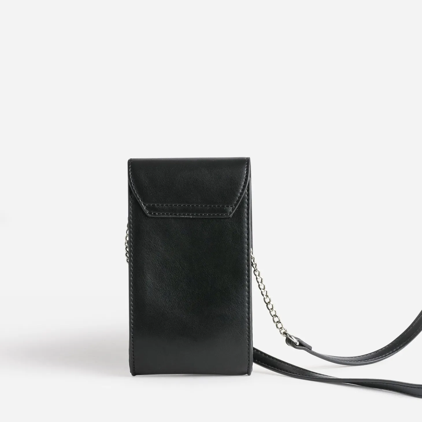 Gardez votre téléphone et quelques cartes toujours à portée de main, c’est l’idée de cette pochette à placer autour du cou, sur l’épaule ou croisée, grâce à sa bandoulière bi matière. En matière synthétique noir, elle gagne en style, par sa barrette métal en V, placée sur le bord du rabat.