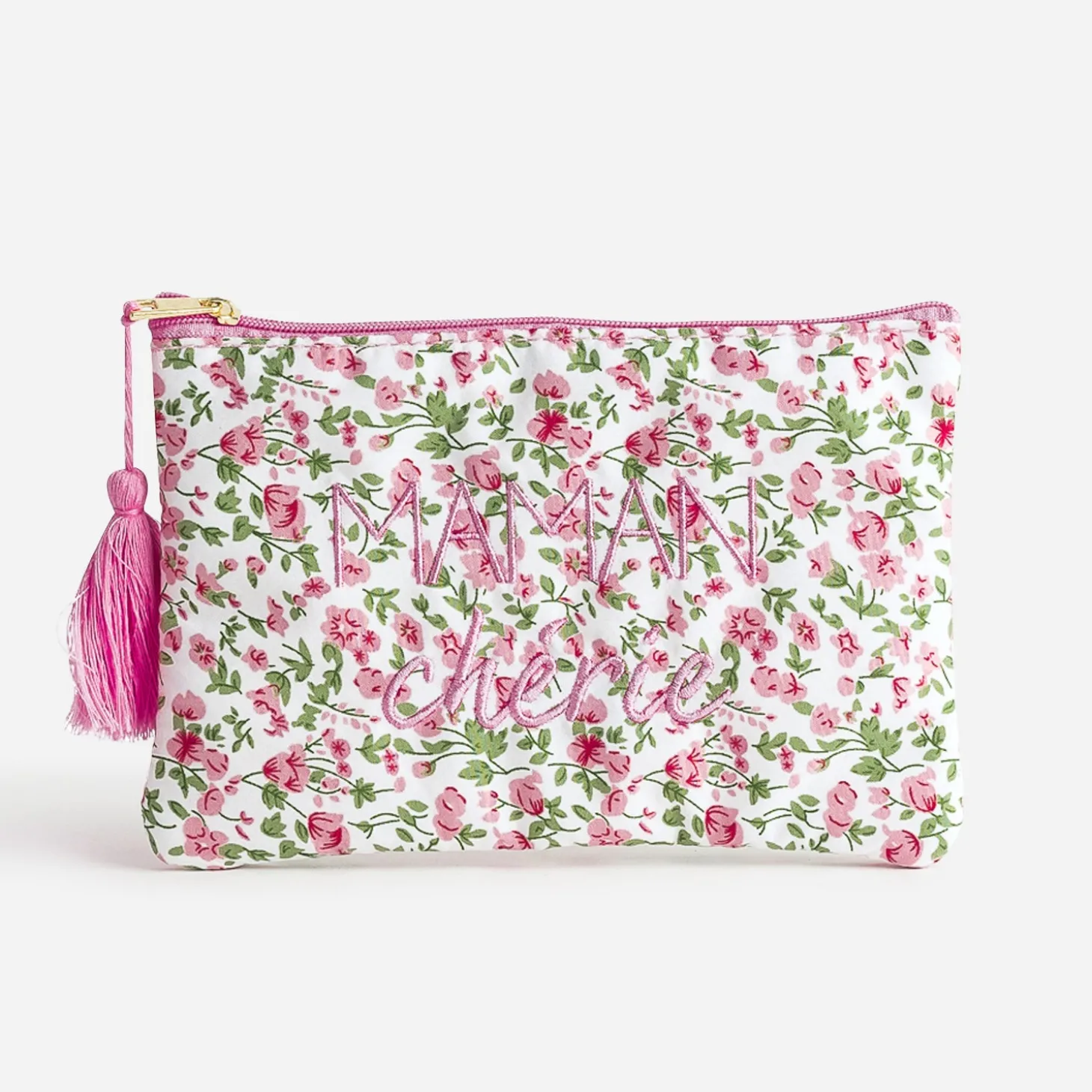 Comme son nom l’indique, ceci est une trousse pour ‘Maman chérie’. En textile fleuri dans les tons rose et vert, elle est décorée d’une broderie et se ferme par un zip. Un accessoire à offrir pour la fête des mères ou pour son anniversaire !