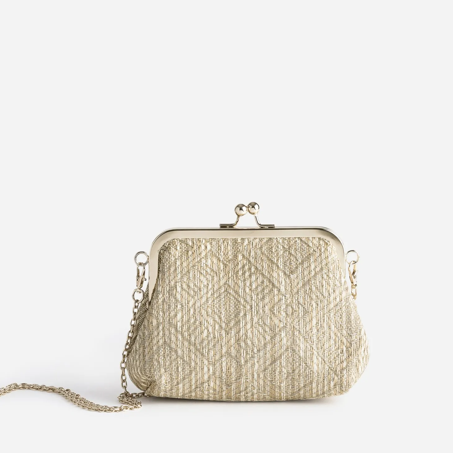 Dès réception d’une invitation, la quête de la tenue idéale prend le dessus. Suivie de près, par celle du sac à main. Inspiré par la forme d’un porte-monnaie, il présente une taille optimale pour n’accueillir que le principal. En matière synthétique beige, il se démarque par son tressage façon raphia, rebrodé de fils dorés et par sa bandoulière-chaînette amovible, pour un porté à la main, sur l’épaule ou croisé. Un modèle plutôt estival, qui fera son petit effet aux prochaines cérémonies et autres évènements de votre vie.