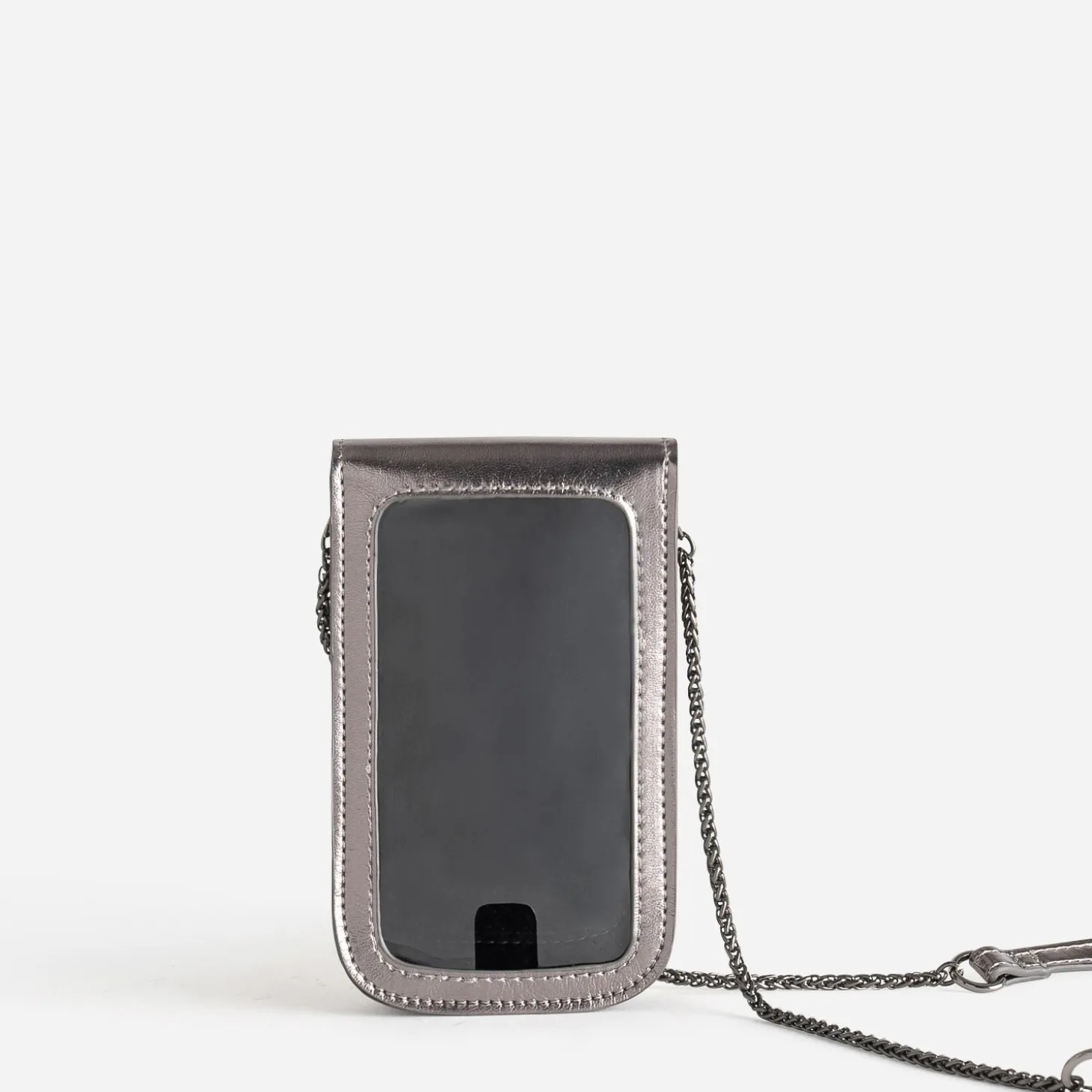 Smartphone, cartes de transport, de paiement, papiers d’identité : il n’en faut pas plus pour voyager… léger. Cette pochette en matière synthétique gris foncé métallisée s’impose comme votre nouvelle alliée. Son atout ? Un empiècement tactile transparent au dos, pour éviter de manquer vos prochains appels. Un accessoire mode et fonctionnel, à porter autour du cou ou cross-body.