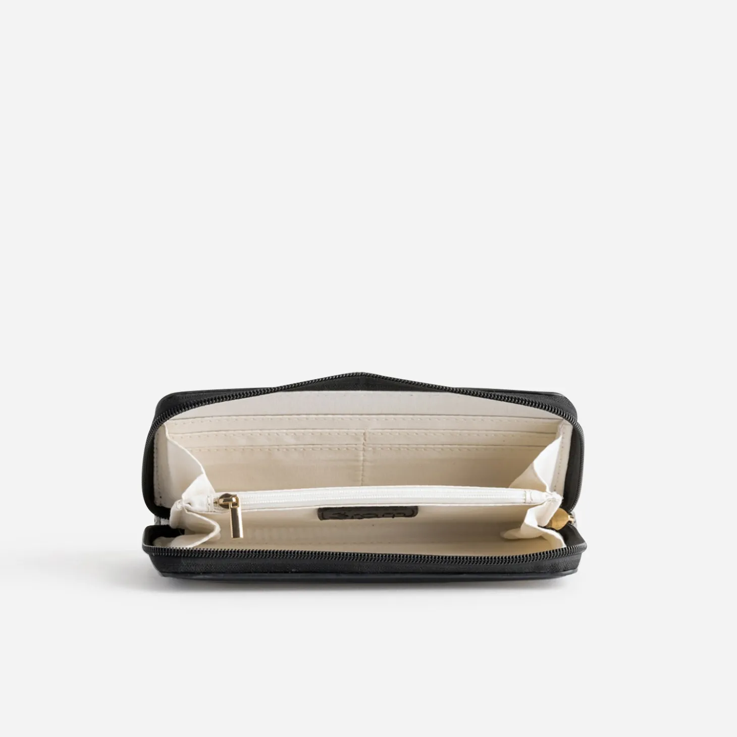 Petit plaisir du jour : sortir un beau portefeuille, pour régler la note ! Mix matière, il associe un textile beige à une matière synthétique lisse noire, dans un combo remarquable. A l’intérieur, vous pourriez y ranger cartes et billets, monnaie et papiers, grâce aux différents compartiments prévus à cet effet. Un accessoire de maroquinerie à mettre entre toutes les mains !