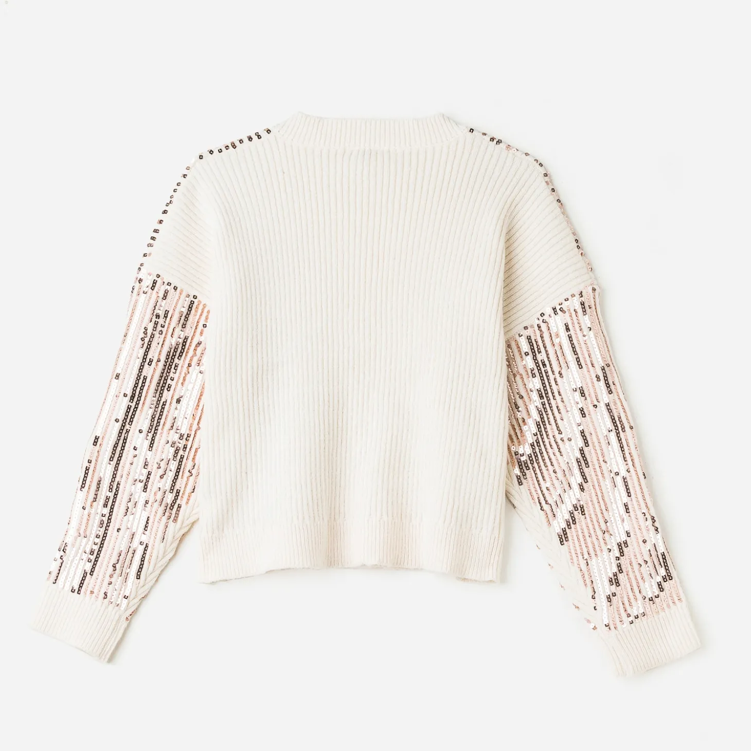 Oui en tricot écru en hiver. Oui aux sequins carrés rose cuivré. Oui au pull bien chaud, qui gagne en chic. Mix polyester et coton, il se porte pour un jour festif ou une soirée d’exception.