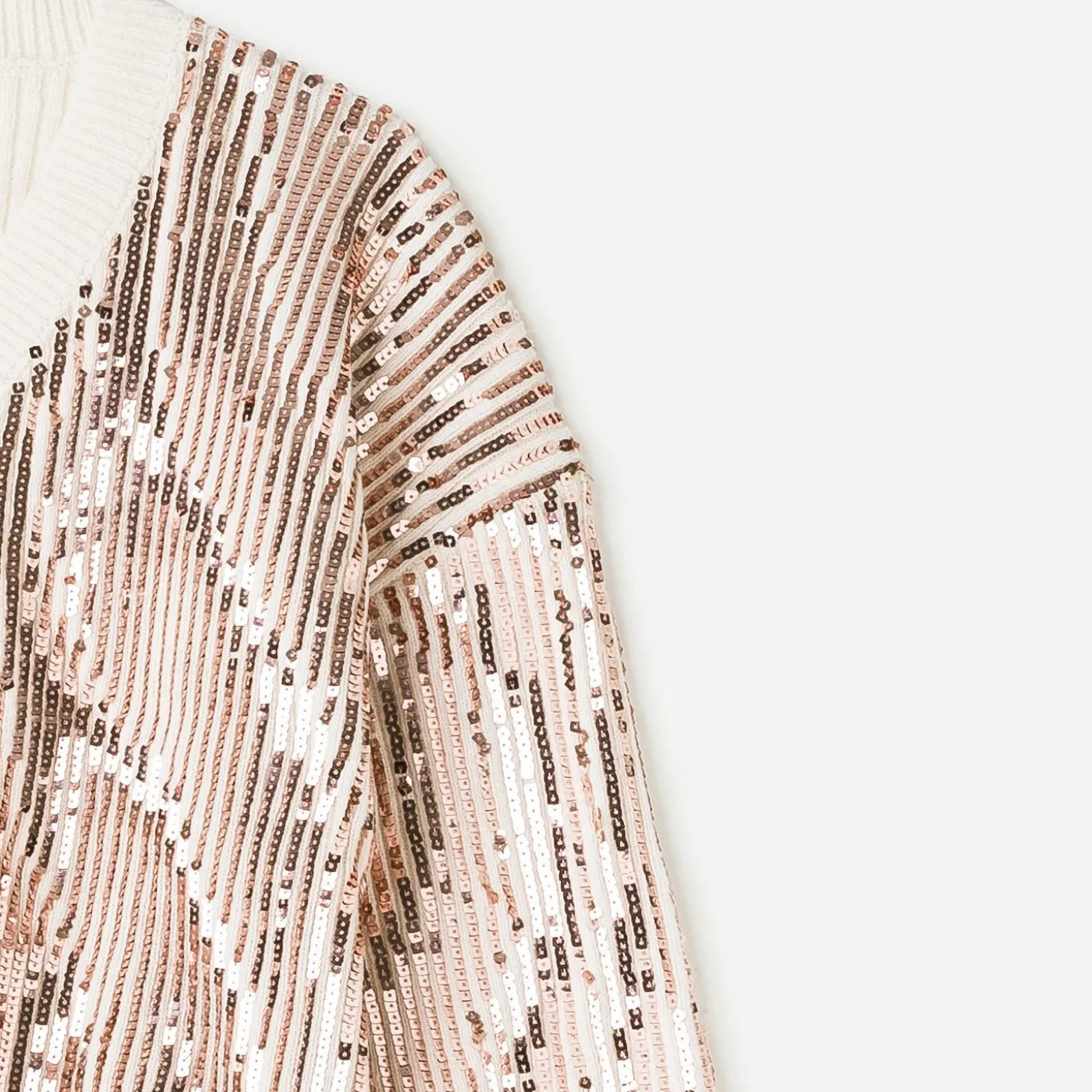 Coupe droite, encolure V, manches longues, broderies sequins rose cuivré, bords-côtes 1×1 au col, manches et buste.