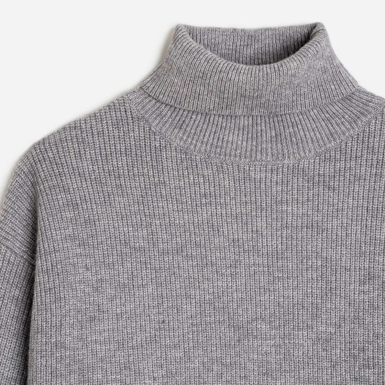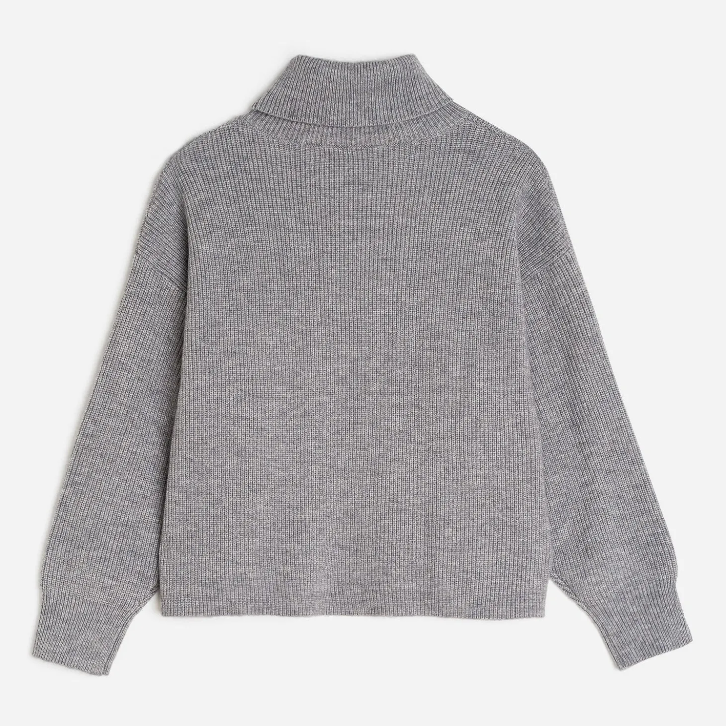 Le plaisir de l’hiver, c’est de se glisser dans un pull oversize. En tricot gris, il associe col roulé et emmanchures descendues, pour un style décontracté.