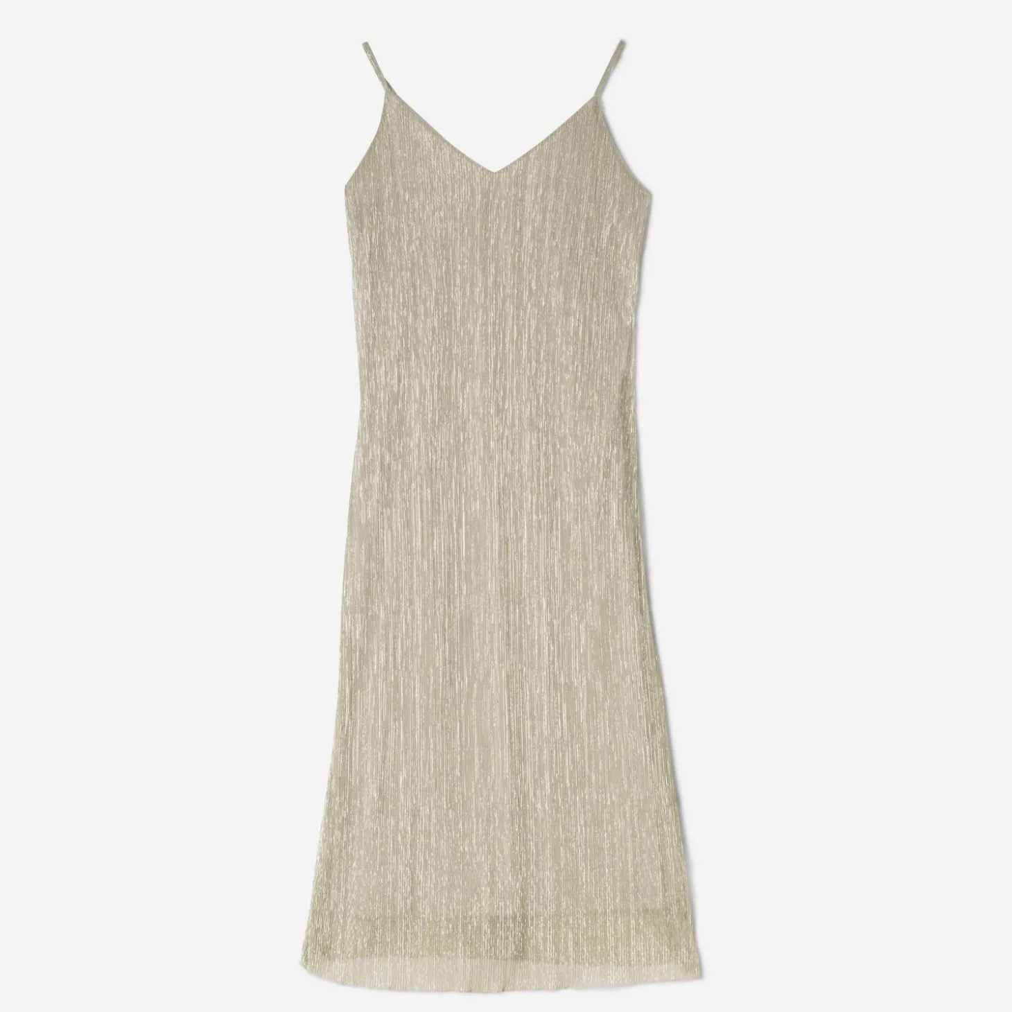 La slip dress, reconnaissable à ses bretelles spaghetti, a conquis le monde de la mode. De couleur beige, sur un tissu plissé à effet rayures dorées, cette pièce versatile, à la fois confortable et élégante, se porte de jour comme de nuit. Pour un look casual en journée, avec une veste oversize et des baskets. En soirée, avec des sandales à talon haut, elle revendique une allure ultra-féminine.