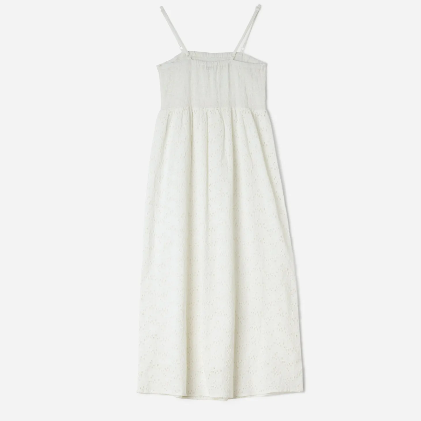Forme droite, col droit, fines bretelles ajustables, smocks sur le bustier, découpe taille, taille élastiquée, broderie anglaise, doublure unie, longueur de la robe : 132 cm pour une taille S