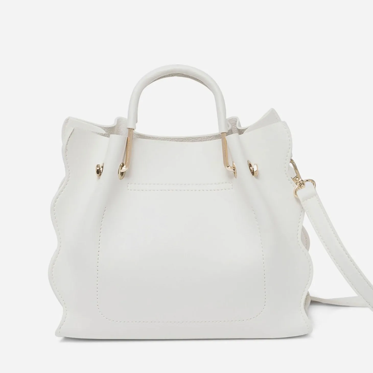 Il revient cet été ! Décliné en coloris blanc immaculé sur une matière synthétique lisse, ce sac à main se démarque par des bords à finition vague, deux anses rigides et un fin ruban beige rayé or. Livré avec une bandoulière réglable et amovible, il se porte sur l’épaule ou croisé, de préférence avec un look sophistiqué.