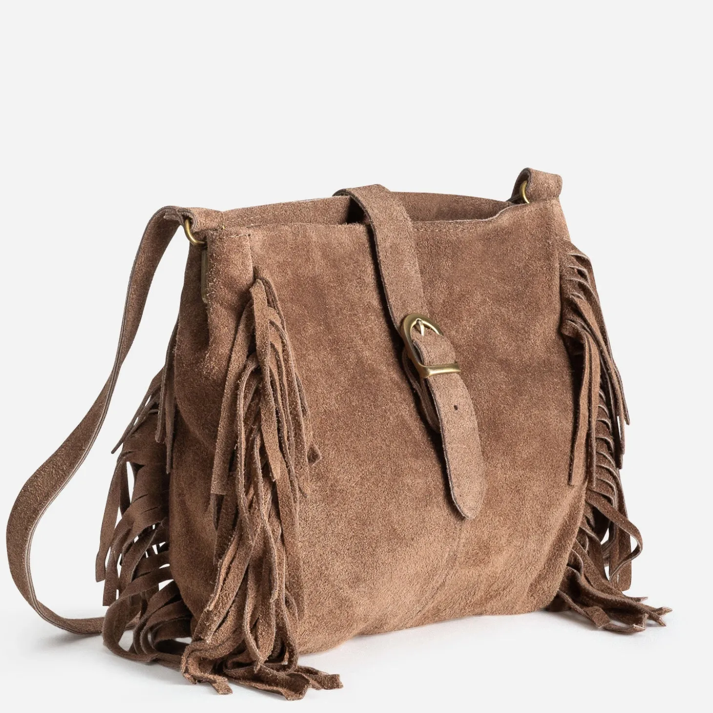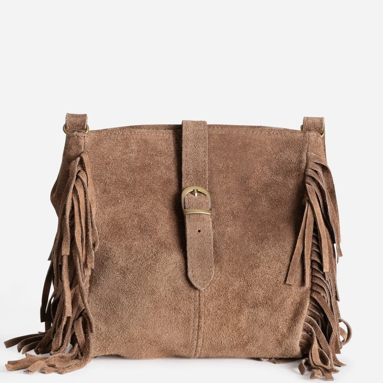 Une des grandes tendances de la saison, ce sont les franges. Elles bordent ce sac à main pour femme en cuir velours taupe, de part et d’autre du compartiment principal ; un compartimentsécurisé par un zip et une patte aimantée, avec une poche interne zippée. La bandoulière réglable s’ajuste pour un porté sur l’épaule ou croisé sur le buste. Amovible, elle peut aussi être échangée pour une version tressée ou imprimée. Un accessoire idéal pour apporter une touche folk à vos looks de la saison.