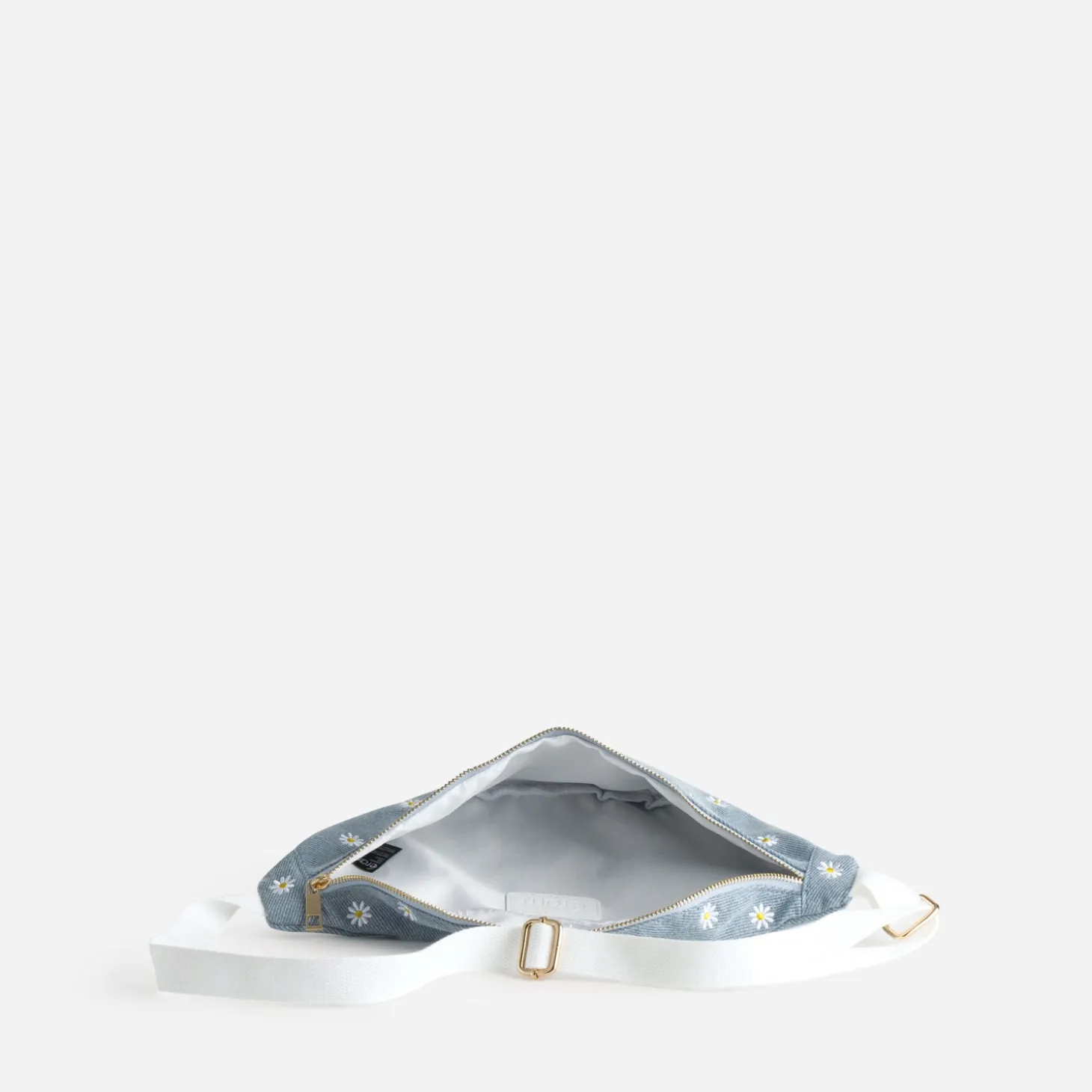 Celui qu’on ne présente plus, c’est le sac banane. Autrefois réservé au style sportswear, il est plébiscité pour sa praticité, libérant les mains, et donc, les mouvements. Revisité en toile bleu clair façon denim, il s’offre des broderies à motif fleurs, façon pâquerettes ou marguerites, se ferme par un zip, et se porte croisé sur le buste, grâce à la bandoulière ajustable. Un accessoire à porter sur un débardeur jaune vif, un short et une veste en jean bleu délavé et une paire des tennis blanches.