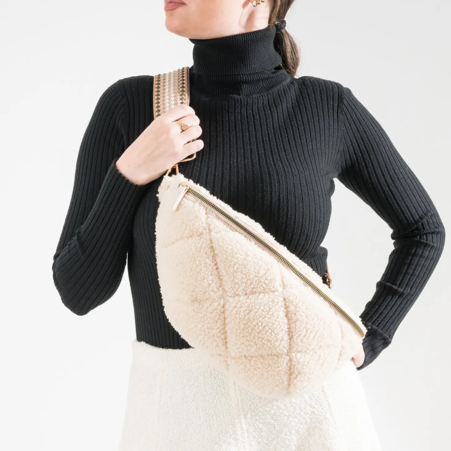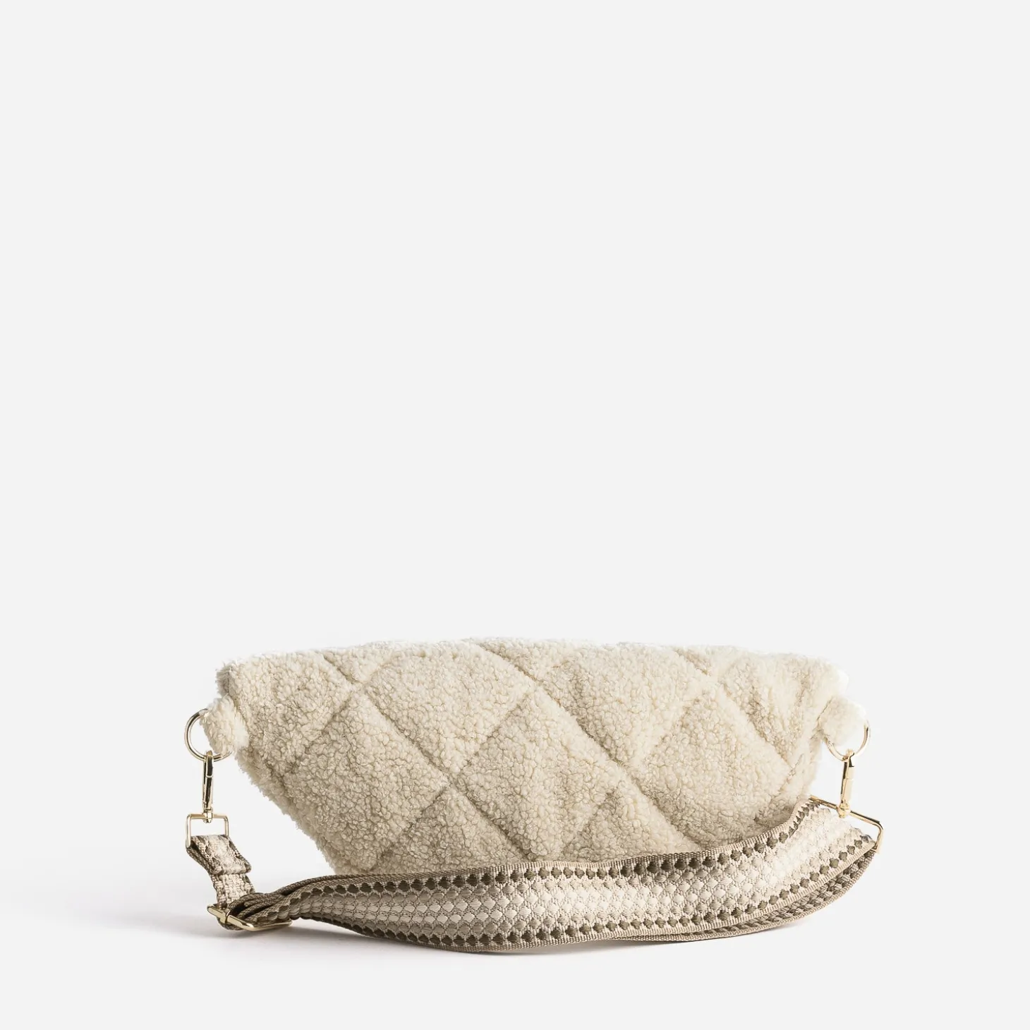 On ne va pas vous l’apprendre : le sac banane est partout ! Laissez-vous séduire par son côté fonctionnel et par son style. En textile sherpa façon bouclette, il se décline en coloris écru, avec jeu de surpiqûres pour effet matelassé. Son volume maxi permet de transporter toutes vos affaires personnelles. La large bandoulière est réglable et amovible, pour ajuster le porté en croisé sur votre buste, ou la troquer pour une autre version. Un it-bag incontournable, à porter tout l’hiver.
