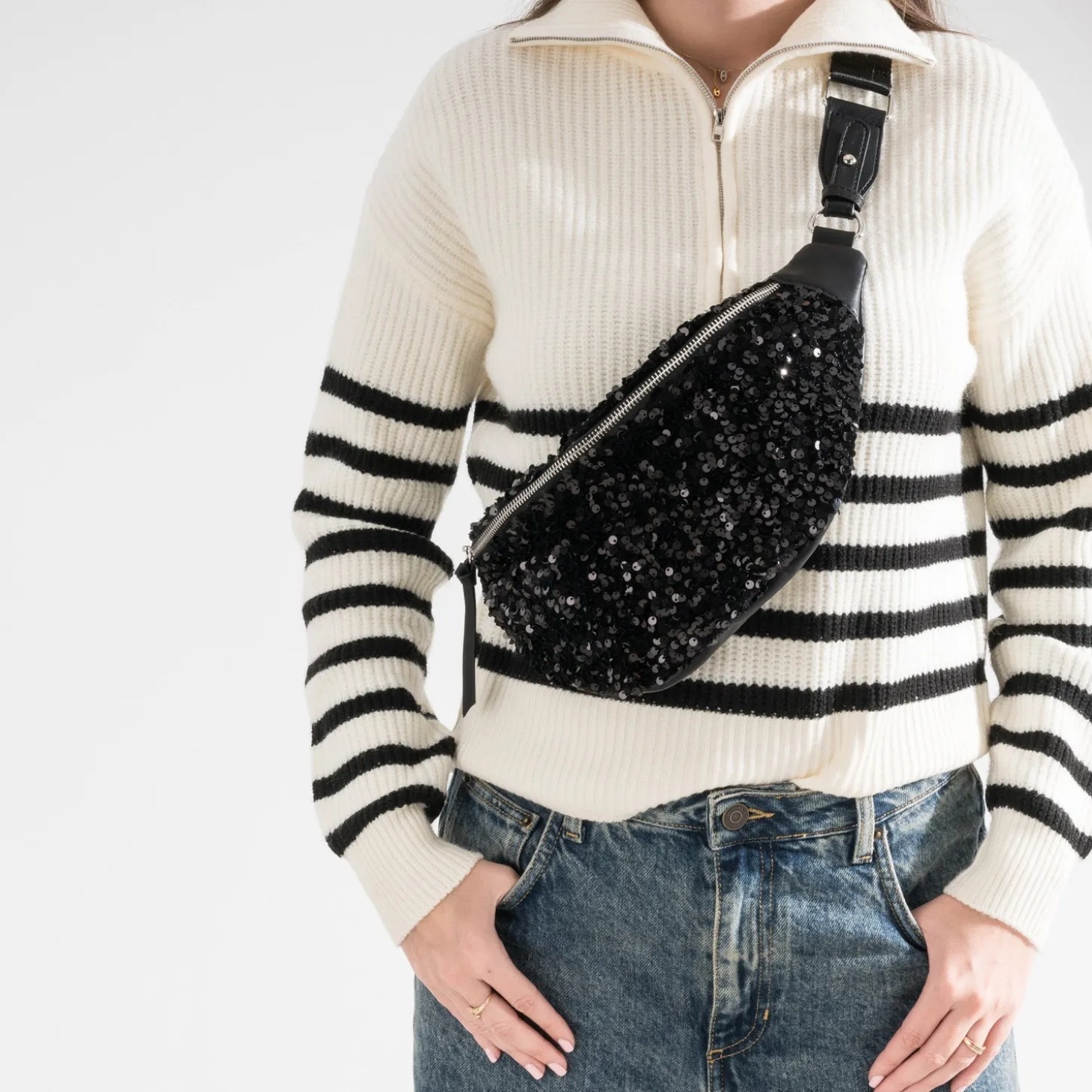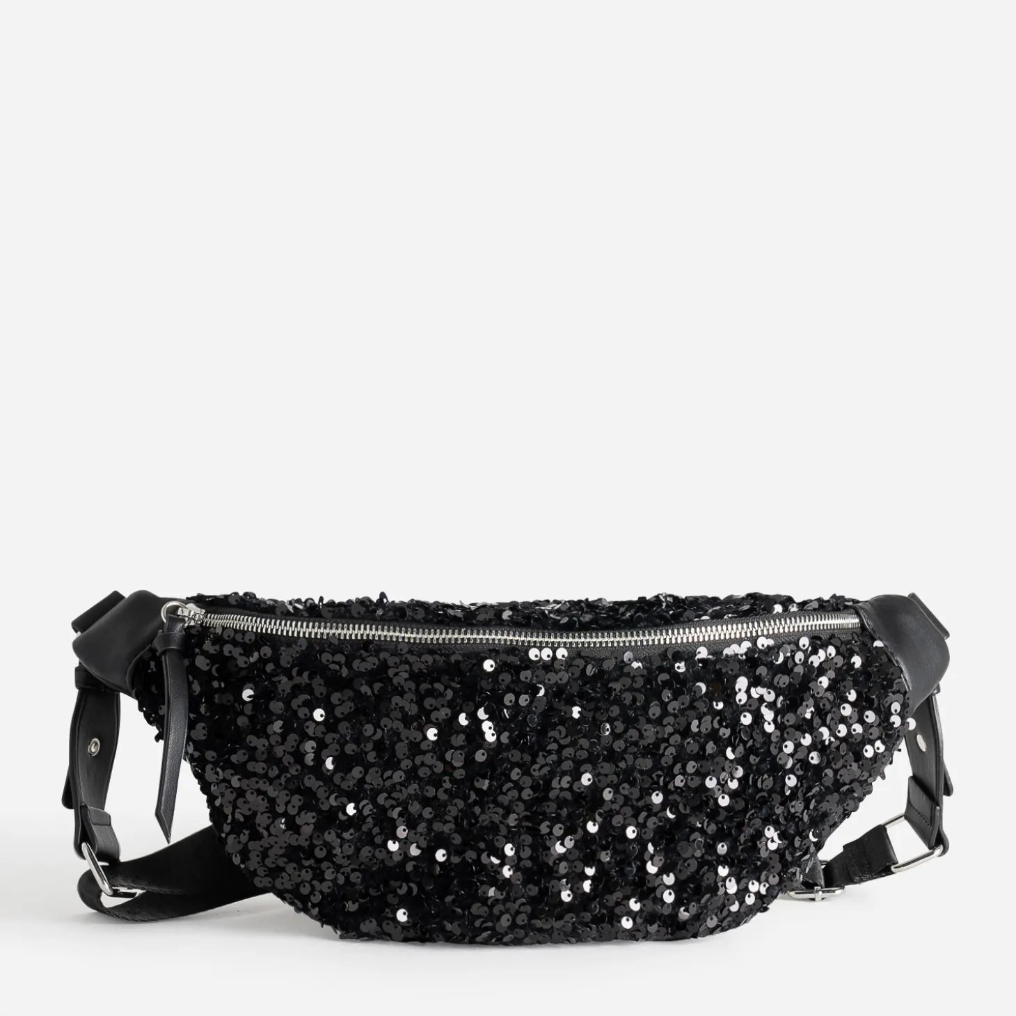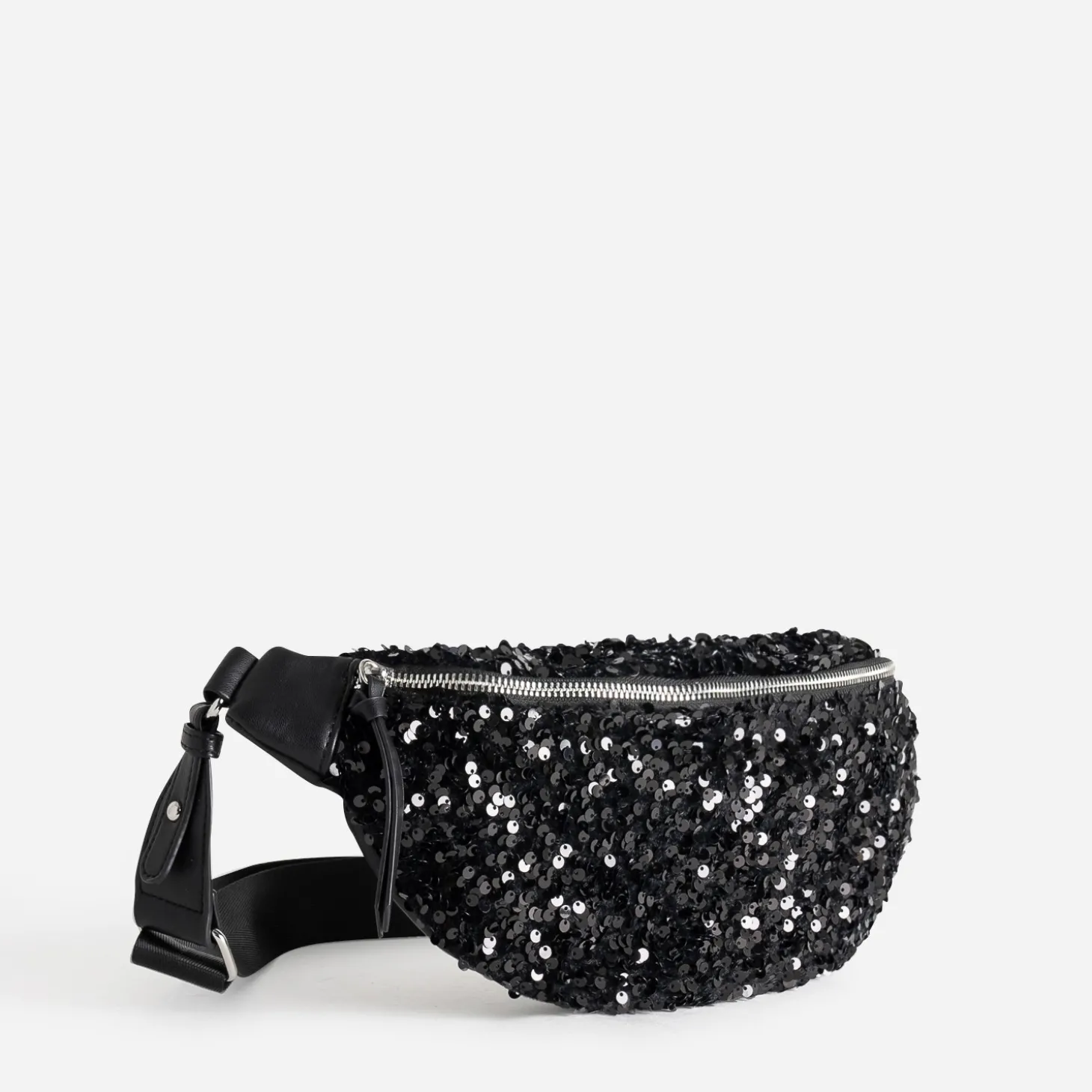 Le sac ultra désirable du moment, c’est la banane. Loin des codes du sport dont elle est issue, elle se réinvente avec un jeu de matière synthétique lisse et textile brodé de sequins, en ton sur ton noir. Le compartiment principal se ferme par zip, et la bandoulière s’ajuste facilement pour un porté confortable. Un accessoire indispensable pour un look stylé, en gardant les mains libres.