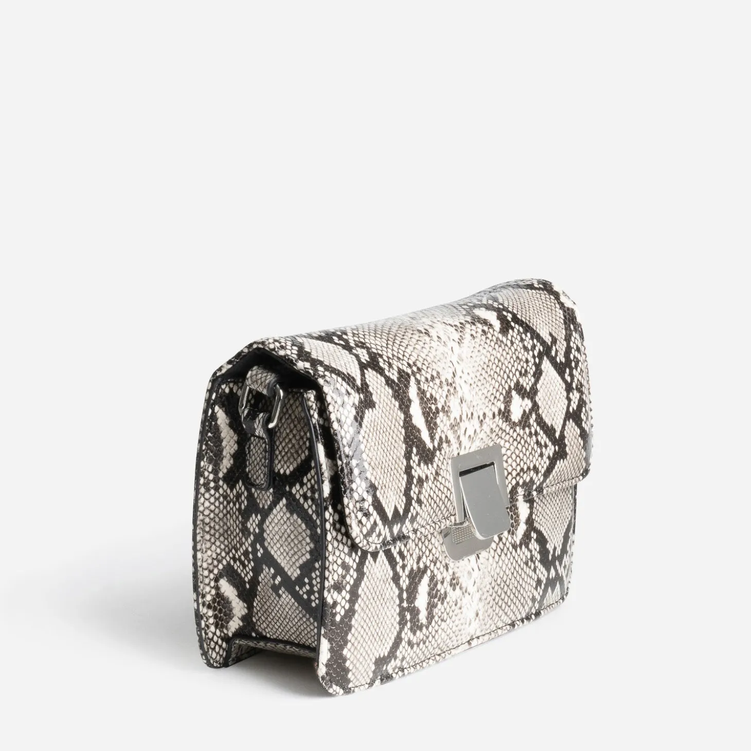 Qui dit rentrée, dit nouveau sac (à main) ! En matière synthétique rigide, il se décline en coloris noir, rythmé d’un imprimé effet python. Son format rectangulaire assure un porté élégant, sur l’épaule ou croisé, grâce à la bandoulière réglable (non amovible). Le rabat se ferme par un système de clip-cartable fantaisie (appuyez vers le bas pour libérer le rabat). Un accessoire à privilégier avec un pull-chaussette rouge foncé à col roulé sur un jean large gris, avec des boots esprit rétro.
