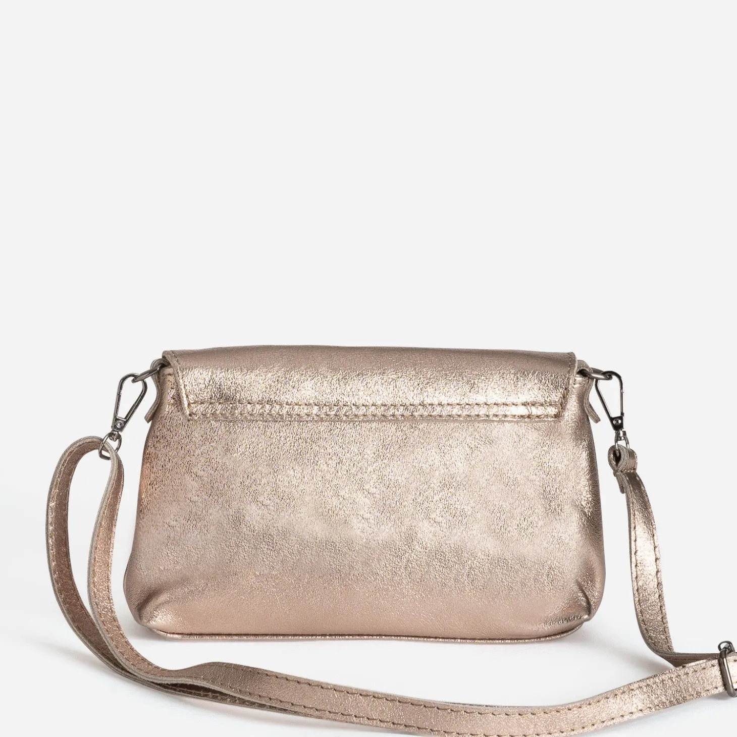 Vous êtes une femme brillante ? Votre sac, aussi ! En cuir métallisé bronze, ce sac à main opte pour un petit format légèrement trapèze, avec bandoulière assortie, réglable et amovible. Parfaitement sécurisé, il se ferme par un zip et un rabat aimanté. Un accessoire à porter sur l’épaule ou croisé sur le buste, pour garder la pleine disponibilité de vos mouvements.
