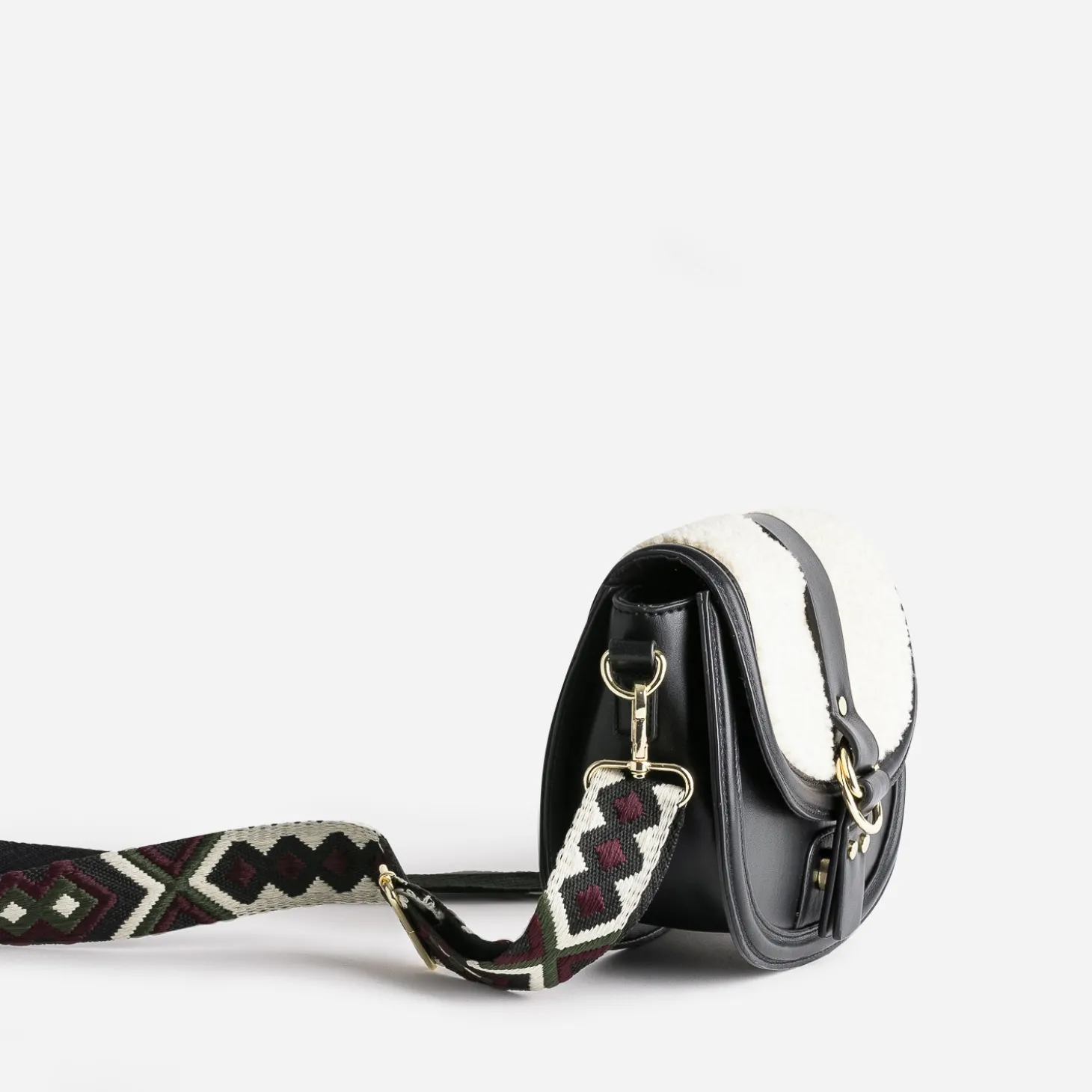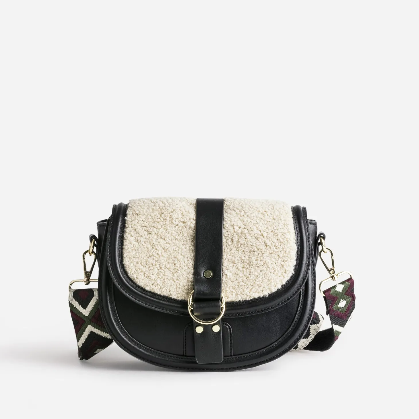 L’hiver appelle des matières plus douces, plus chaleureuses. Optez pour un sac à main de saison, en matière synthétique noire, rehaussée d’un rabat recouvert de tissu Sherpa beige. Il se porte soit sur l’épaule, soit croisé, grâce à une large bandoulière tissée à motif ethnique, ajustable et amovible. Un modèle à associer avec un look dans les mêmes tons.