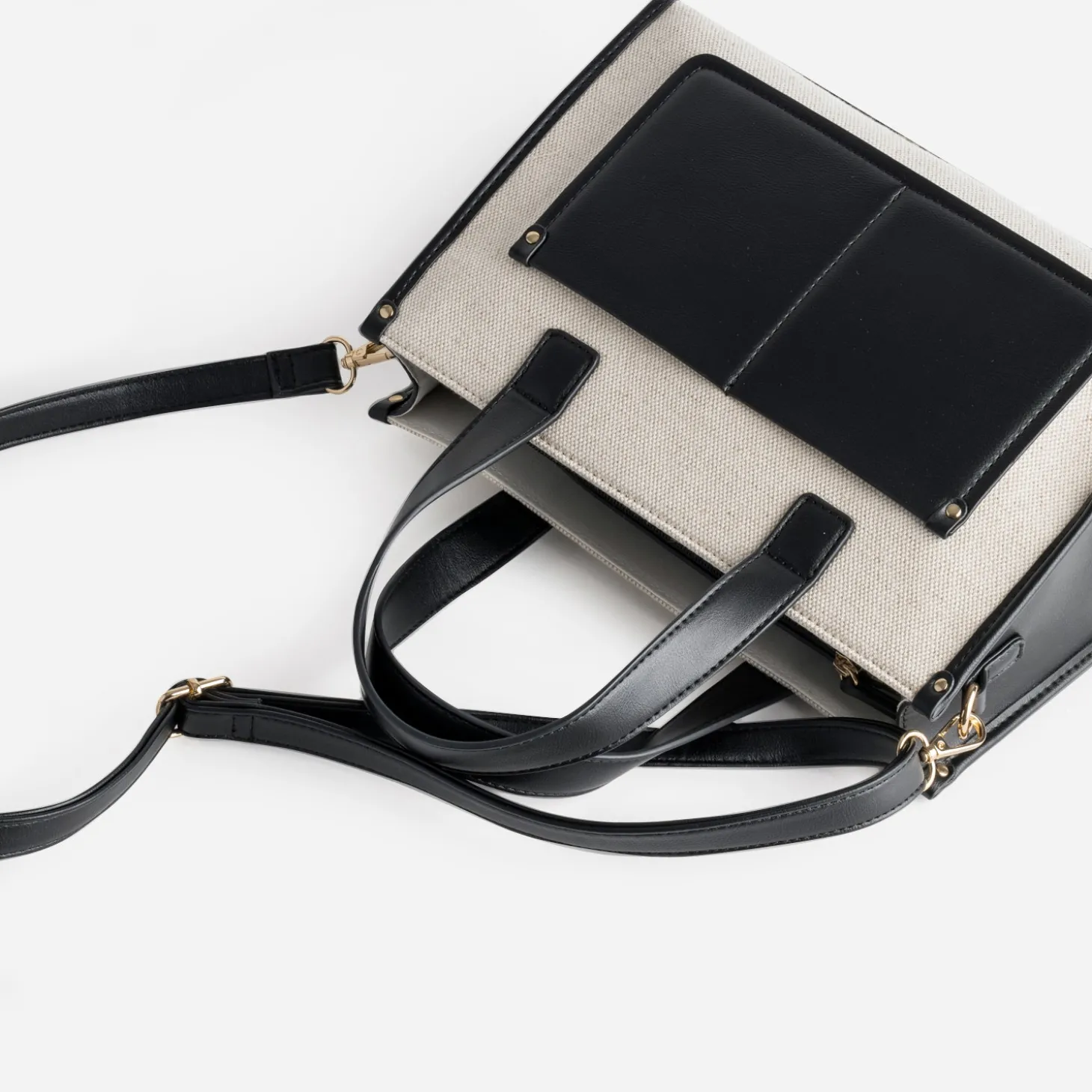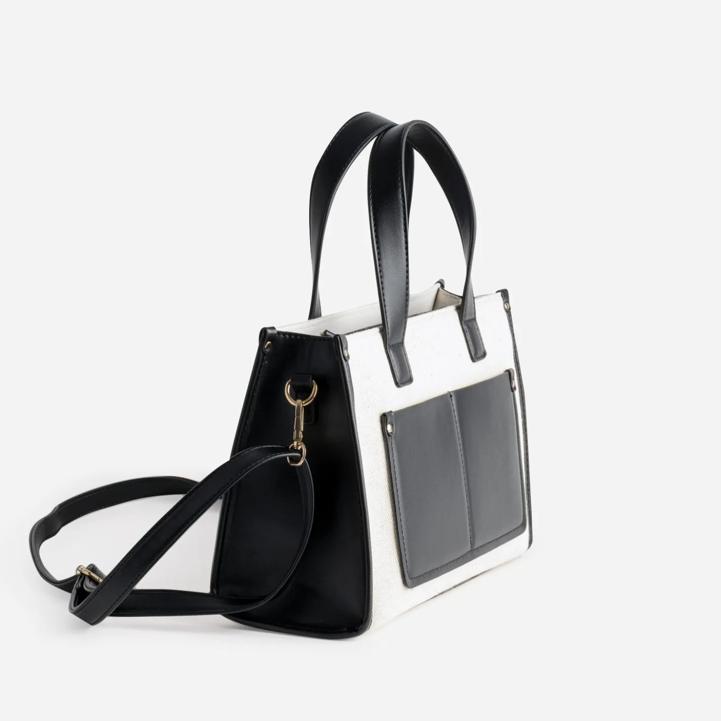 Nouveau format de cabas pour ce sac à main très féminin. Mix de toile beige et de matière synthétique lisse noire, il joue les contrastes pour assoir son style, à la fois élégant et intemporel. A l’intérieur, deux compartiments permettent d’optimiser les rangements, avec, en complément, une poche centrale zippée, trois poches internes, dont une zippée, trois poches externes, dont une zippée. Les deux anses courtes offrent un porté à la main, et la bandoulière réglable et amovible, un porté sur l’épaule ou croisé. Un modèle sobre, à associer avec un top fluide, un pantalon large noir, des mules plates beiges.