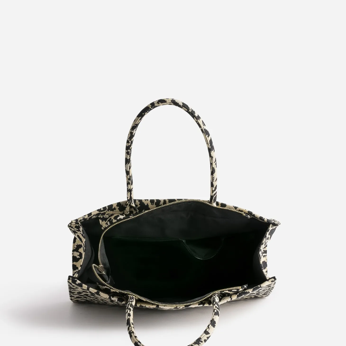 Confirmez votre envie d’évasion, avec un sac cabas digne de ce nom ! Animé d’un motif léopard noir, sur textile beige, il plaît pour son format idéal, pour transporter vos dossiers pro, ordi compris, comme vos affaires personnelles. Ses 2 anses se portent à la main, sur le bras ou sur l’épaule. Profitez-en pour sortir vos pièces en lin, dans les tonalités de blanc, beige, noir ou kaki.
