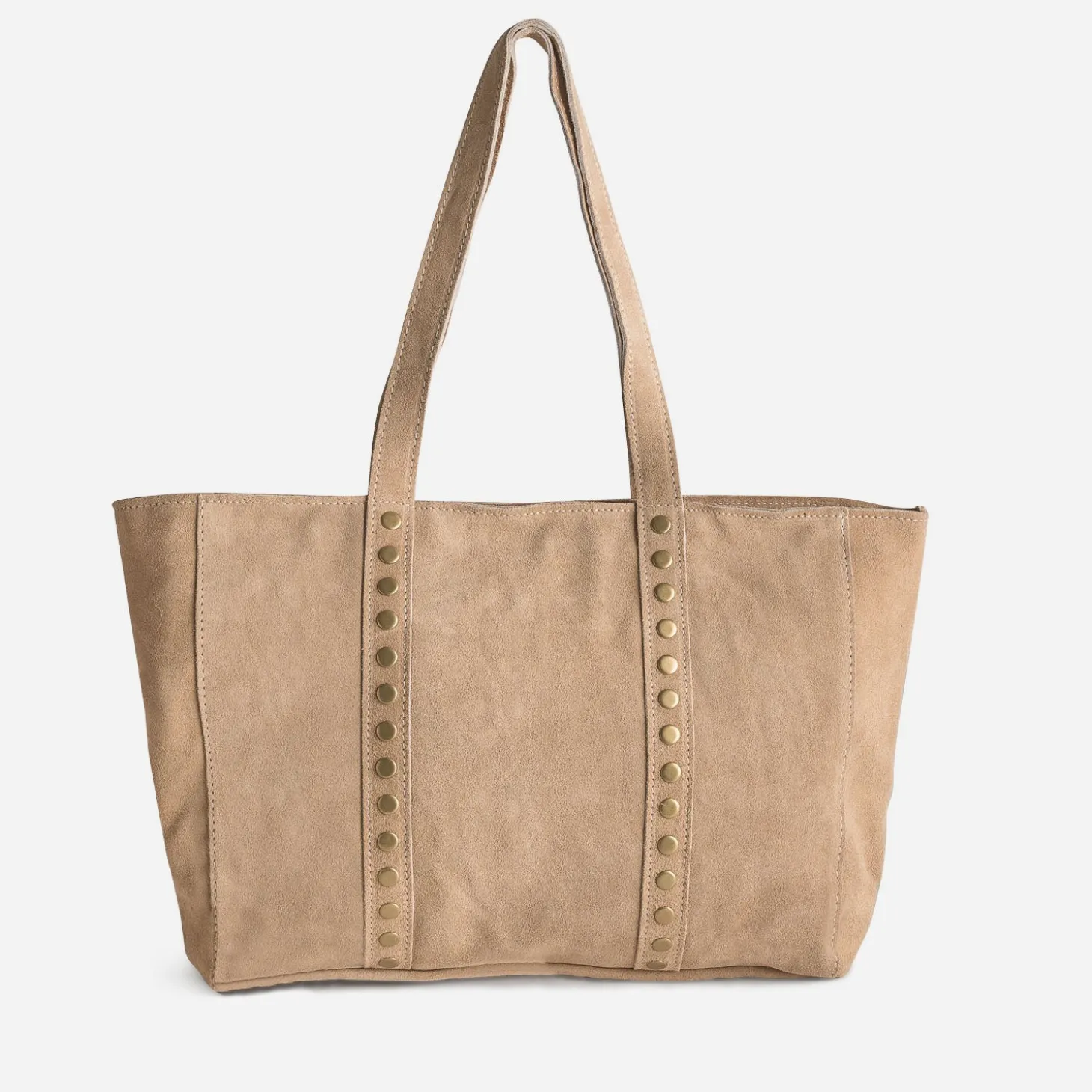 Le sac cabas a ses adeptes, qu’importe la saison. Confectionné en cuir velours beige, il se porte exclusivement sur l’épaule, par deux anses, prolongées par des décors de clous en métal jaune vieilli. Un accessoire indispensable au format généreux, fermé par un zip, idéal pour emporter tout ce dont vous avez besoin, et même un peu plus.