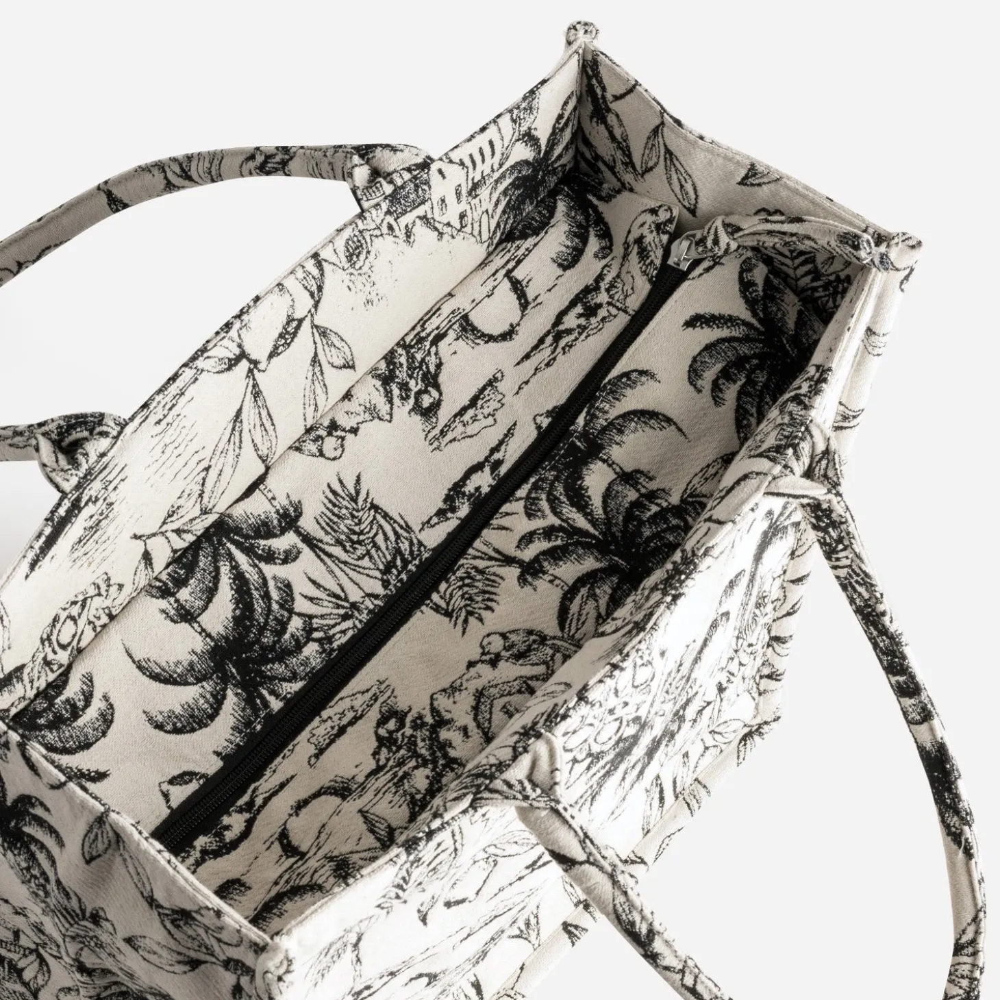 Voilà un cabas qui ne passe pas inaperçu. Imaginé pour contenir tous vos effets personnels, ce grand modèle est confectionné dans un tissu jacquard à motif villages, invitant oiseaux et feuillage, en coloris noir sur fond beige. Porté main ou épaule, il est idéal au quotidien. Le nouveau sac d’été à associer avec un look chic comme plus décontracté.