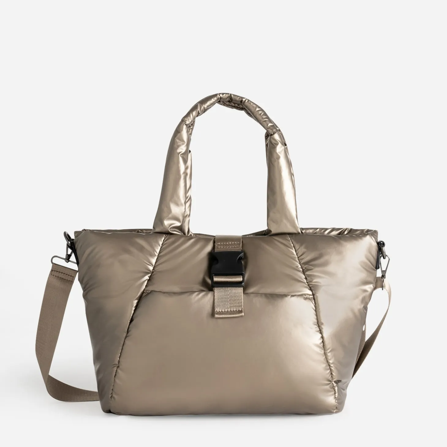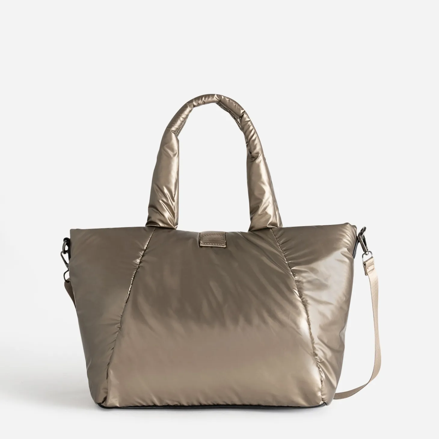 Si la doudoune revient dans le dressing à l’approche de l’hiver, le sac cabas y puise son inspiration cette saison. En nylon bronze, il lui copie son gonflant, jusqu’aux anses à poser sur l’épaule, et son matelassage spécifique. Il se ferme par un zip, doublé par un clip, emprunté au sac à dos. Un modèle casual, à préférer avec un look décontracté, sweat, jogging et sneakers en tête.