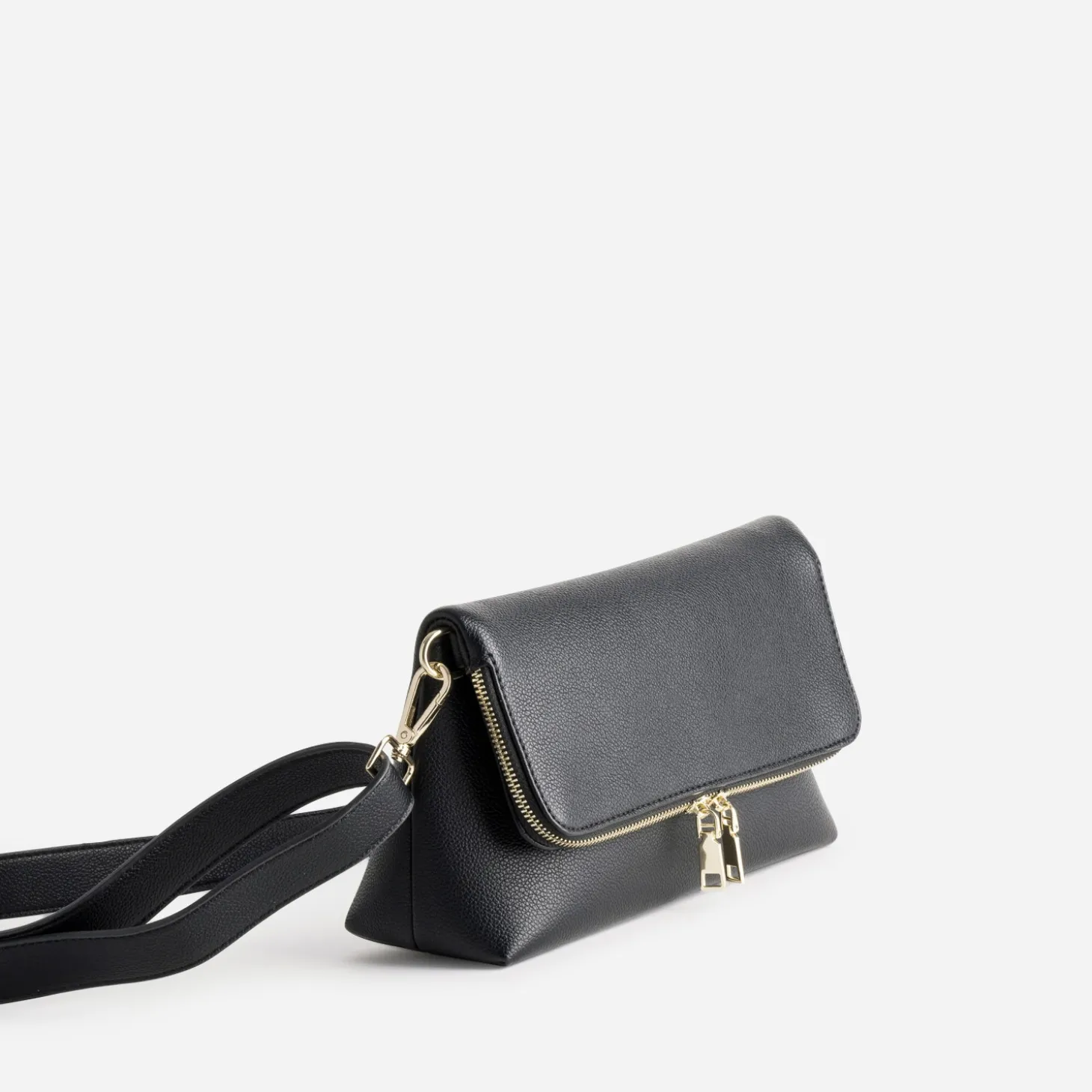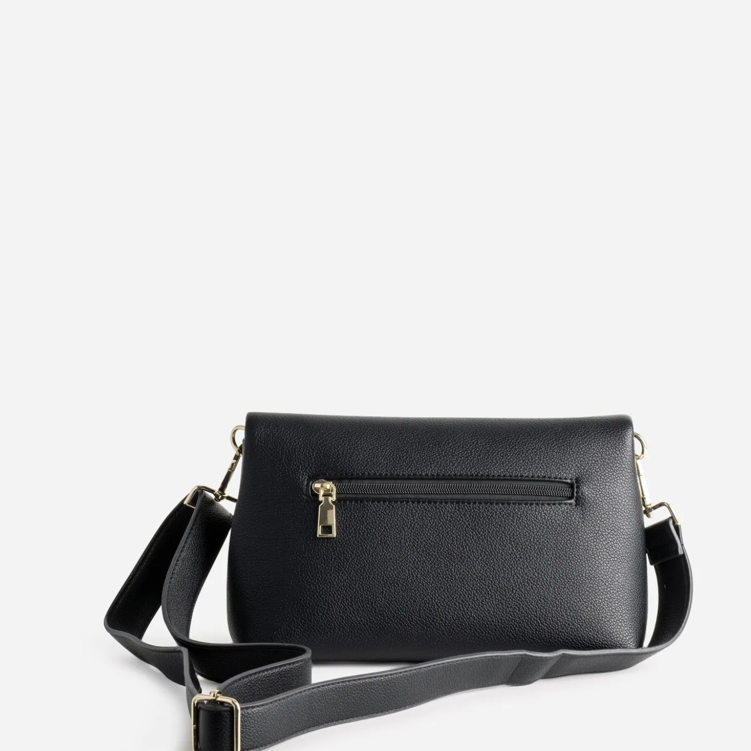 Tour de magie en action ! Ce sac à main pour femme crée la surprise, par une forme trapèze s’ouvrant, en hauteur, sur un grand compartiment fermé par un double curseur et qui se replie sur le devant, comme un rabat aimanté. A l’intérieur, la poche zippée permet d’isoler clés ou cartes. En matière synthétique grainée, il se décline en coloris noir, avec métalleries dorées. La bandoulière amovible et réglable permet d’ajuster le porté sur l’épaule ou croisé. Un accessoire fonctionnel et intemporel, pour vous accompagner au quotidien.