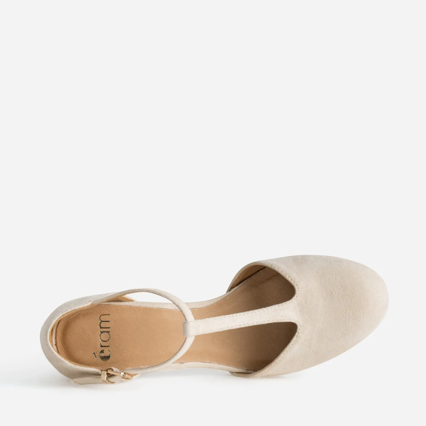 Allure rétro intemporelle pour ce salomé pour femme. En textile suédé, il se décline en coloris beige, très sobre. Monté sur un talon de 7 cm, son design spécifique est reconnaissable à sa bride en T, posée sur le dessus du pied. Un modèle à twister avec un top écru et une jupe longue portefeuille rose poudré.