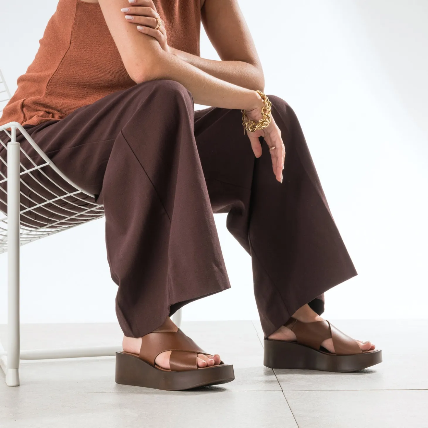Un confort indéniable, un style remarquable. La sandale pour femme n’a pas fini de vous surprendre. Deux larges brides en cuir lisse enveloppent le pied, posé, lui, sur une semelle à plateforme et légèrement compensée. Et son coloris camel ? Une évidence, pour composer des looks élégants au quotidien. Un modèle à privilégier avec une robe chemise midi bleu marine et des bijoux dorés, avec un débardeur parme et un pantalon large prune.