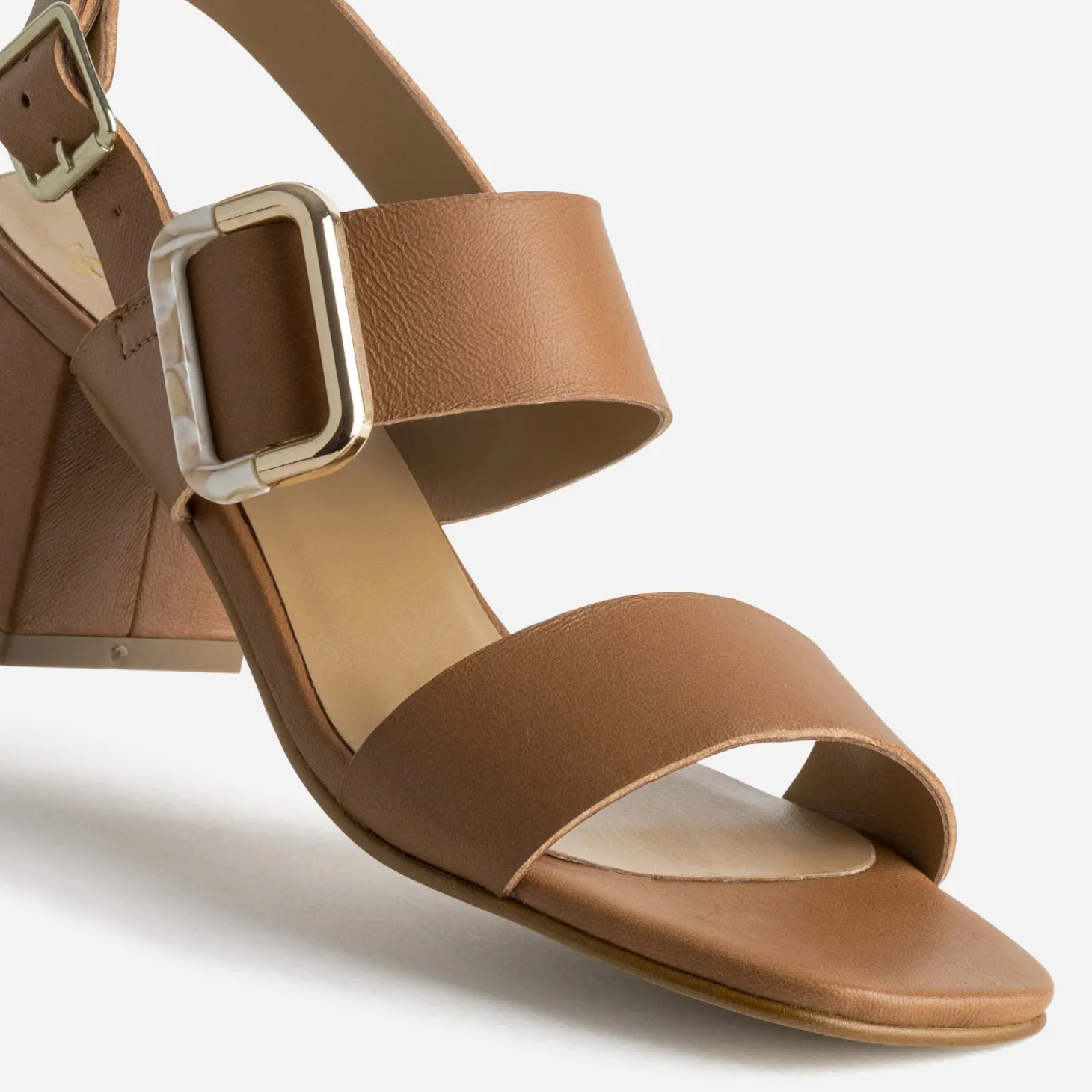 Prenez le temps. Le temps de choisir un cuir souple de qualité, d’opter pour un coloris camel très élégant, de monter sur 6 cm de talon. Résultat : cette sandale femme est un concentré de tout ce que vous aimez. Sa signature ? Une boucle rectangulaire bi-matière, alliance de métal jaune et de résine façon marbre. Un modèle très féminin, à décaler avec une robe courte en jean brut, ornée d’un plastron volanté.