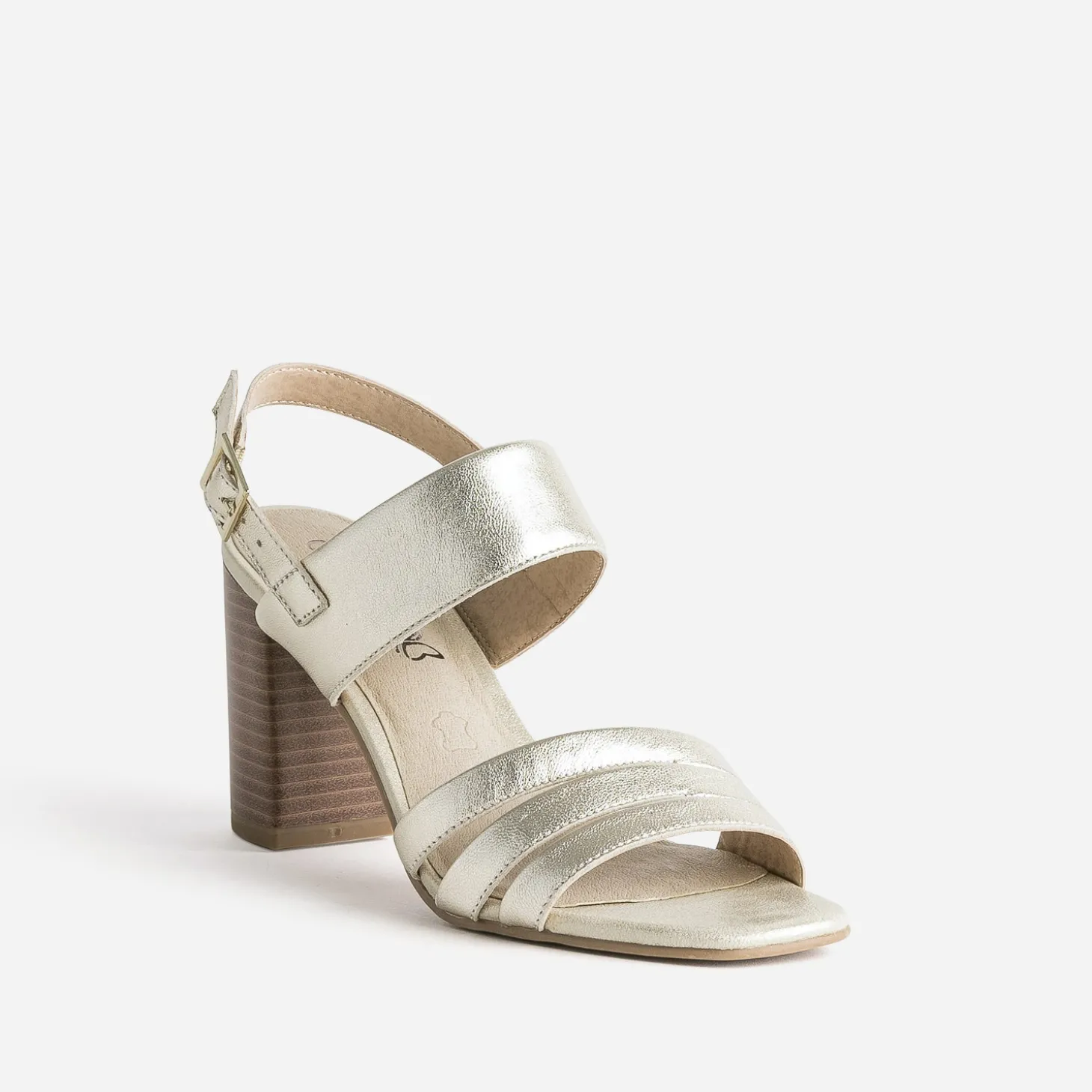 Et si vous vous laissiez surprendre par la sandale à talon ? Confectionnée en cuir lisse, elle se décline en coloris doré. Son talon de plus de 8 cm gagne résolument en confort grâce à une semelle moussée. Un modèle à réserver pour une belle occasion, avec, pourquoi pas, un tailleur-pantalon.