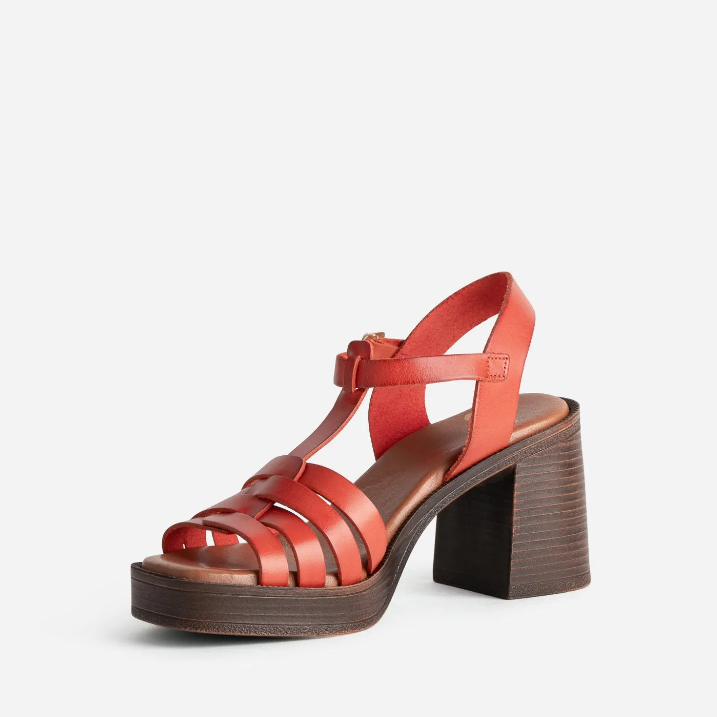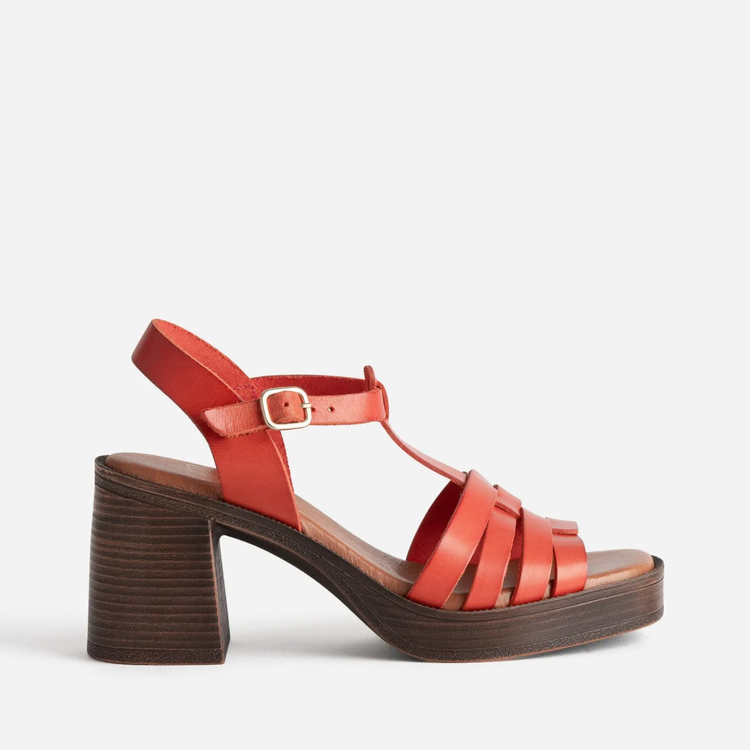 Cette sandale pour femme est tout simplement l’incarnation d’un confort qui ne compromet pas le style. Montée sur un talon large parfaitement stable et surprenant de légèreté, elle accueille le pied sur une semelle moussée et élance la silhouette. Les brides en cuir orange assurent un maintien parfait tout en apportant de la couleur aux looks. Un modèle que vous aurez plaisir à porter du lundi au dimanche, avec une chemise fluide beige inspirée de la saharienne et un short à taille haute ceinturée kaki, très baroudeuse urbaine.