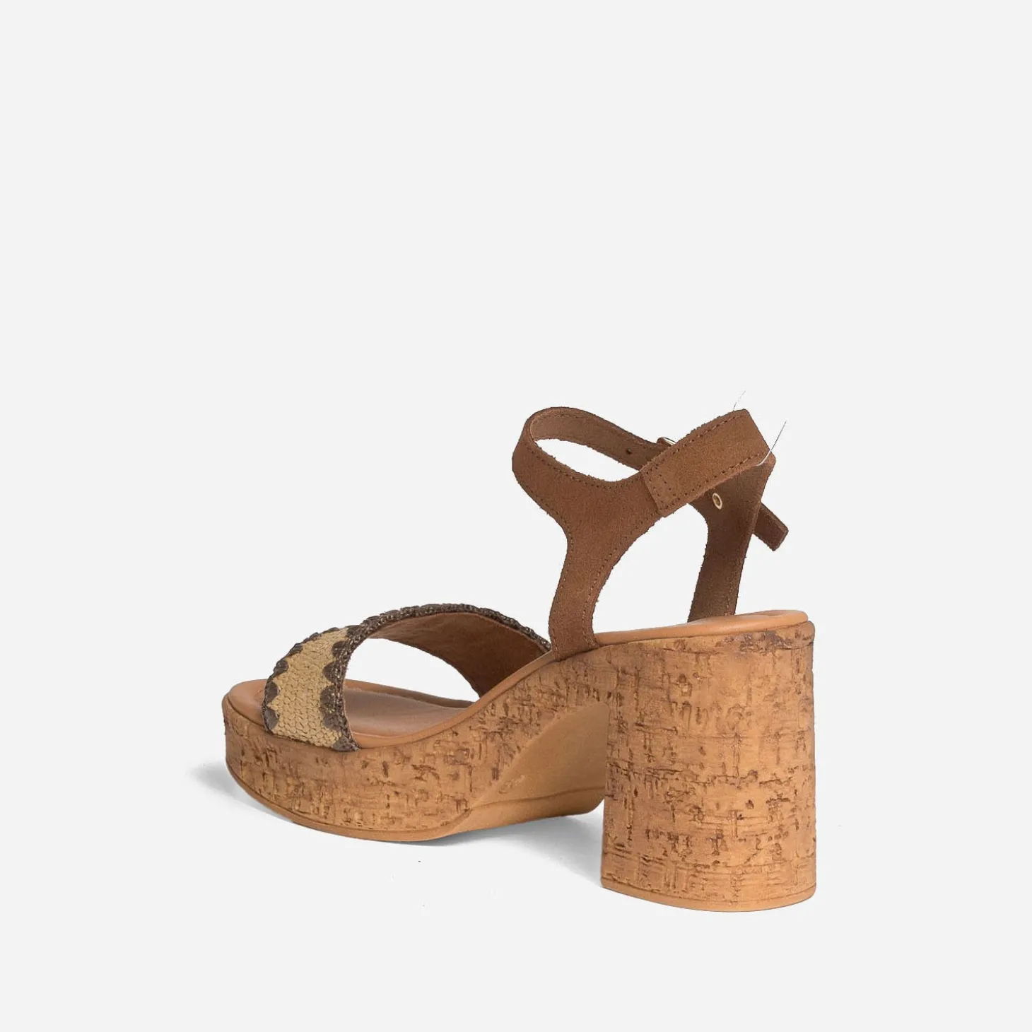 Allure ethnique chic assurée pour cette sandale pour femme. Montée sur un talon large effet liège soulagé par un patin avant, elle maintient le pied par une large bride beige tressée et une bride plus fine en cuir velours marron clair autour de la cheville. Un modèle à harmoniser avec un pull à manches courtes rose, un pantalon large cropped beige, et une ceinture camel.