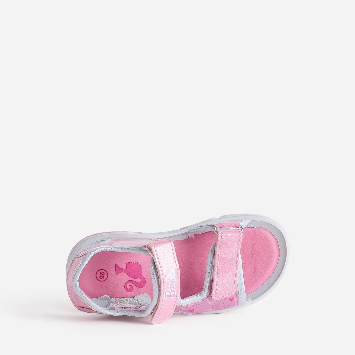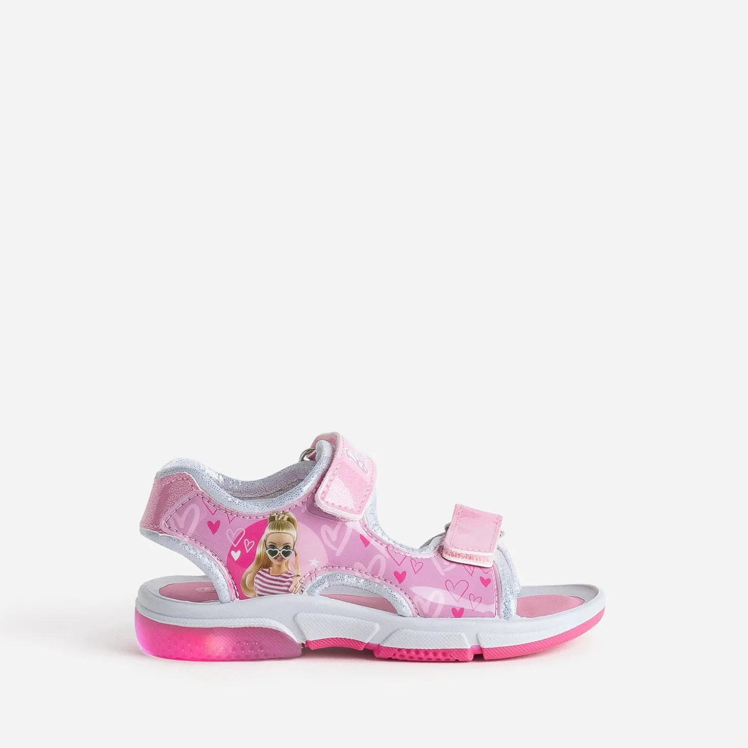 Impossible de ne pas remarquer son logo, imprimé sur le scratch. Impossible de perdre sa trace, grâce à la semelle clignotante. Matière synthétique rose vif et blanc, tout pailleté : cette sandale compile tout ce qu’adorent les petites filles ! Sans oublier, sur le côté, un portrait de la blonde la plus célèbre des cours de récré !