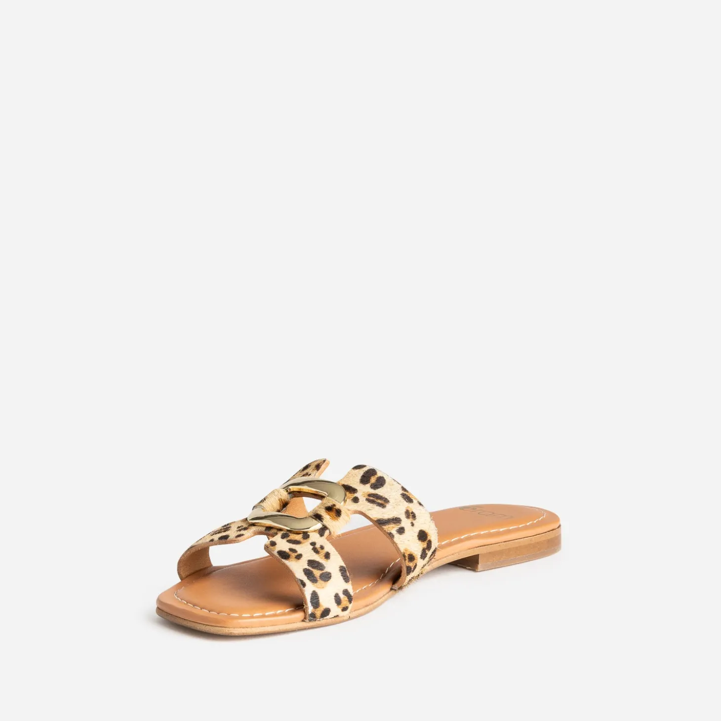 La mule a quitté les plages pour s’inviter en ville, finalisant des looks de style casual chic. La large bride, confectionnée en cuir façon poulain à motif léopard, est rythmée de découpes graphiques et décorée d’un anneau en métal doré. Plate, elle s’accorde aussi bien avec un top noir à encolure carrée et un jean cropped blanc, qu’avec une robe longue noire.