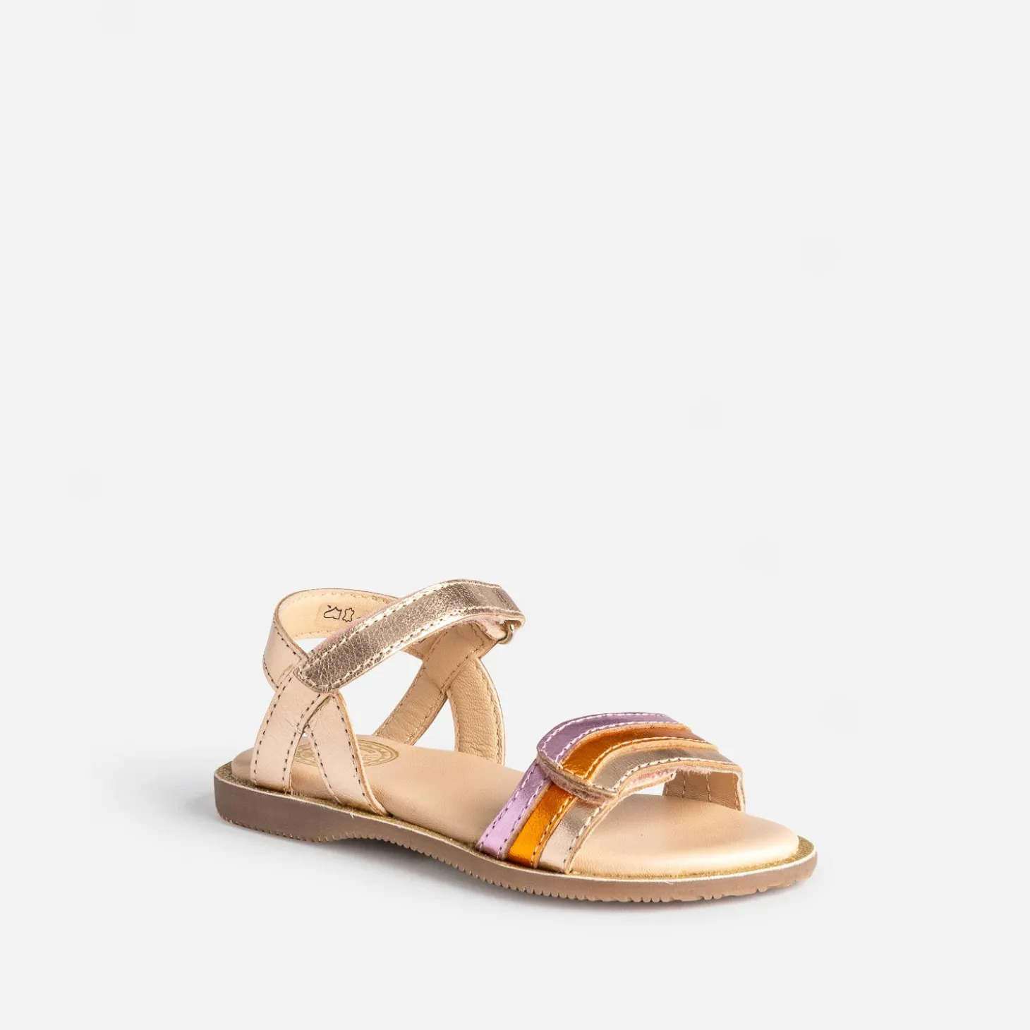 Les petites filles ont souvent des envies mode très ciblées : de la brillance et du doré. Cette sandale exauce tous leurs vœux : du cuir métallisé, une bride tricolore avec du rose vif et du orange, des paillettes sur la trépointe. Idéale pour une cérémonie, elle fonctionne aussi avec toutes ses robes d’été. Son scratch réglable à l’avant permet d’adapter la sandale à la morphologie du pied.