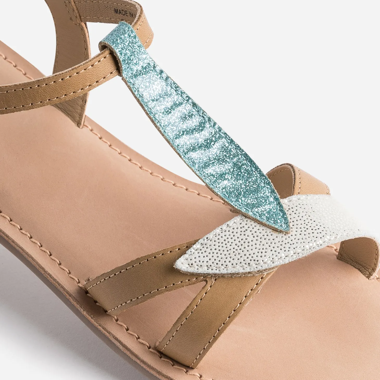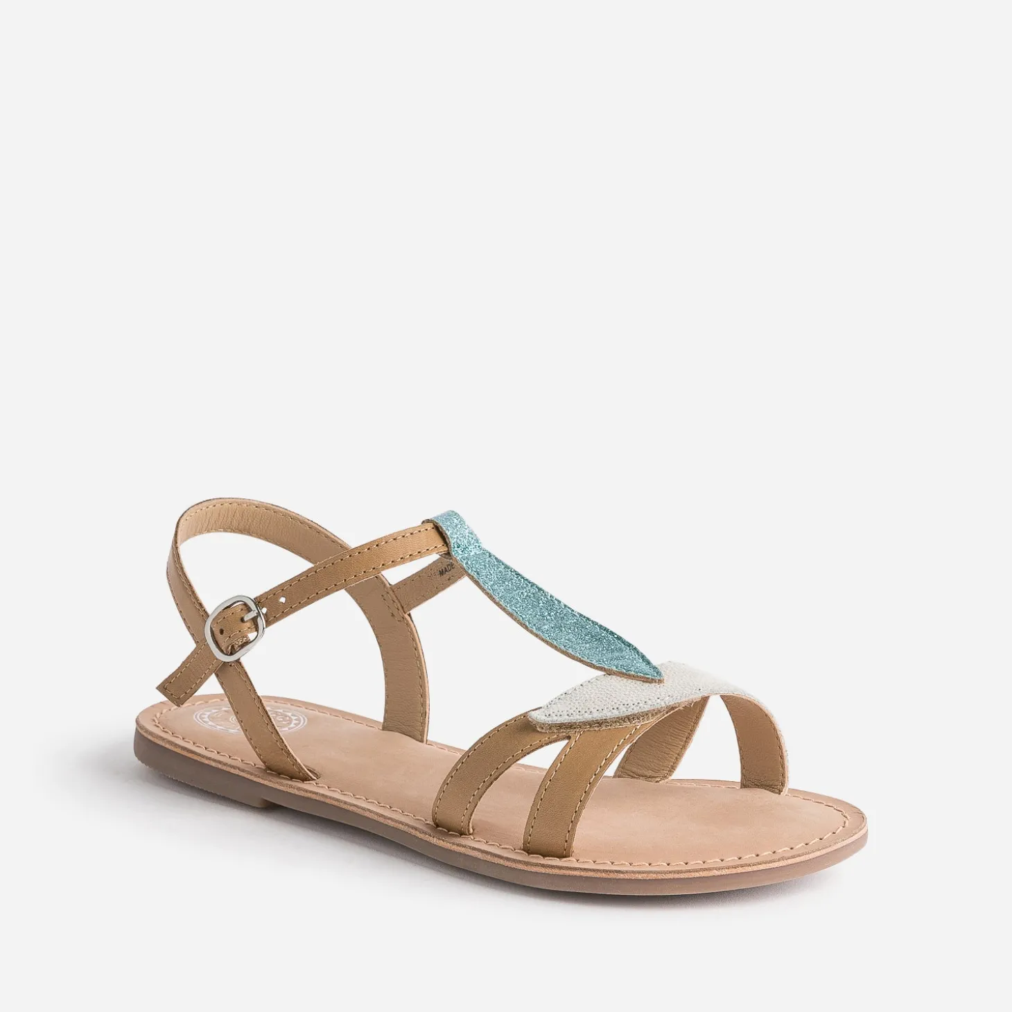 Esprit bohème chic pour cette sandale junior fille. En cuir camel, elle présente deux feuilles en guise de brides, l’une beige à motif argenté, l’autre turquoise pailleté. A réserver pour une cérémonie comme pour le quotidien.