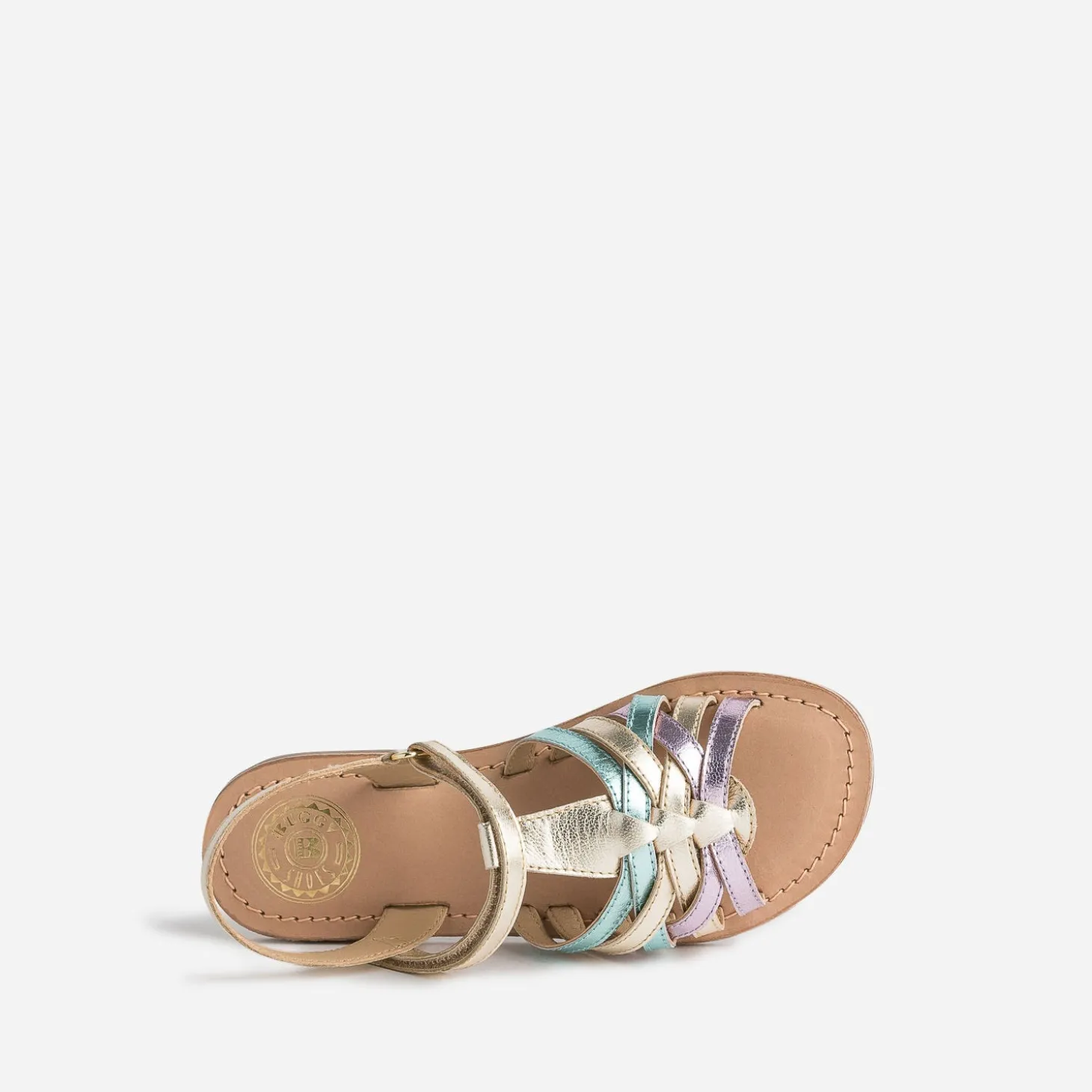 Le cuir métallisé a le pouvoir de sublimer chaque tenue d’une touche chic ; il habille cette sandale pour fille, dans les tons de doré, parme et vert, dans une belle harmonie. La fermeture par scratch facilite l’autonomie et permet ajustement, confort et maintien du pied. Un modèle à choisir pour une cérémonie, et à porter tout au long de la saison.