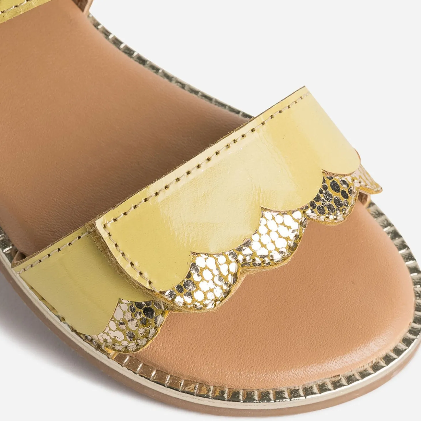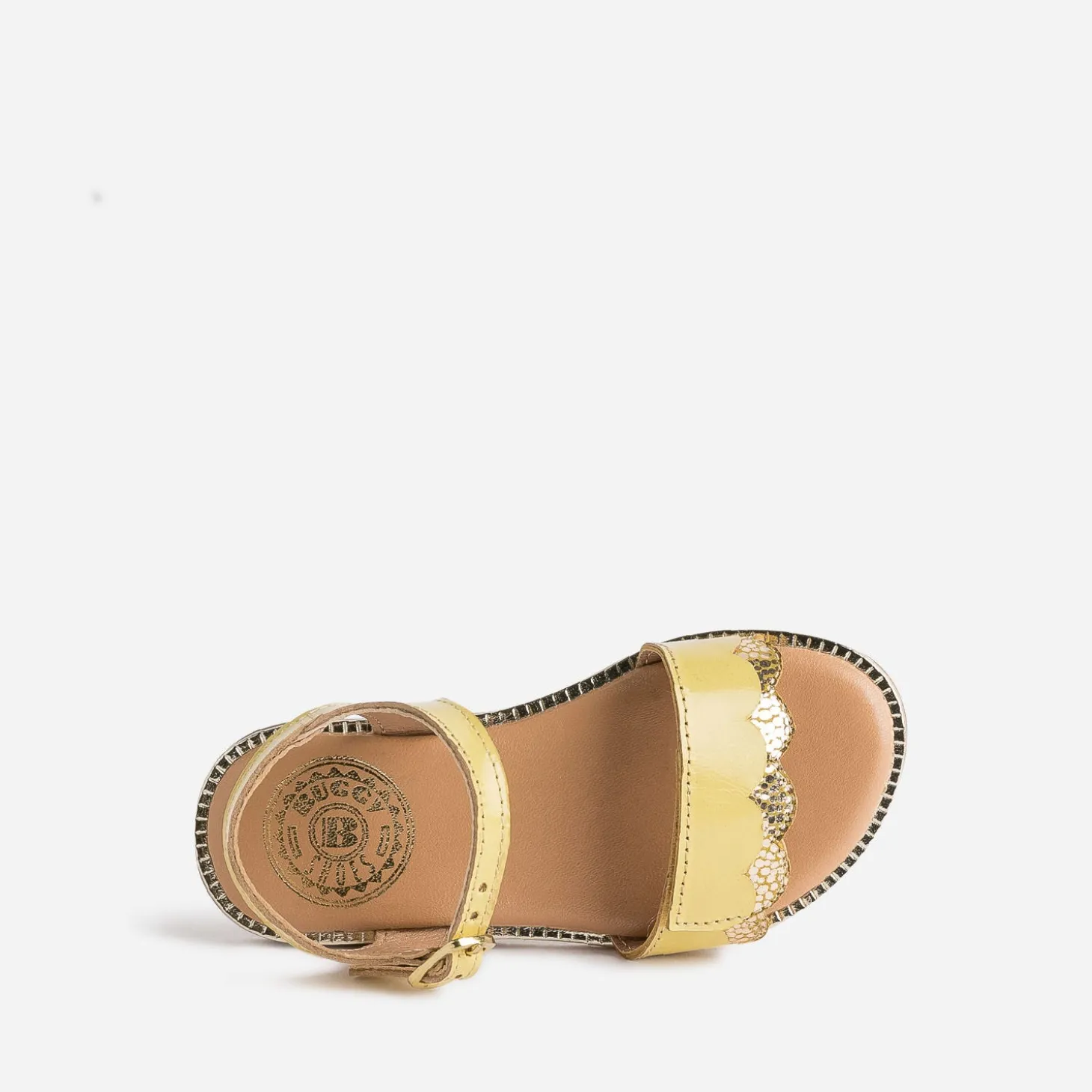 Vous cherchez le soleil ? Il est là. Juste à ses pieds. Dans une sandale en cuir jaune verni, bordé de doré, en écho à la trépointe. Sur la large bride, posée sur le dessus, des découpes vagues apportent un twist chic. Scratch et boucle s’associent pour maintenir parfaitement le pied. Un modèle à essayer avec un tee-shirt blanc et une robe salopette en jean bleu.