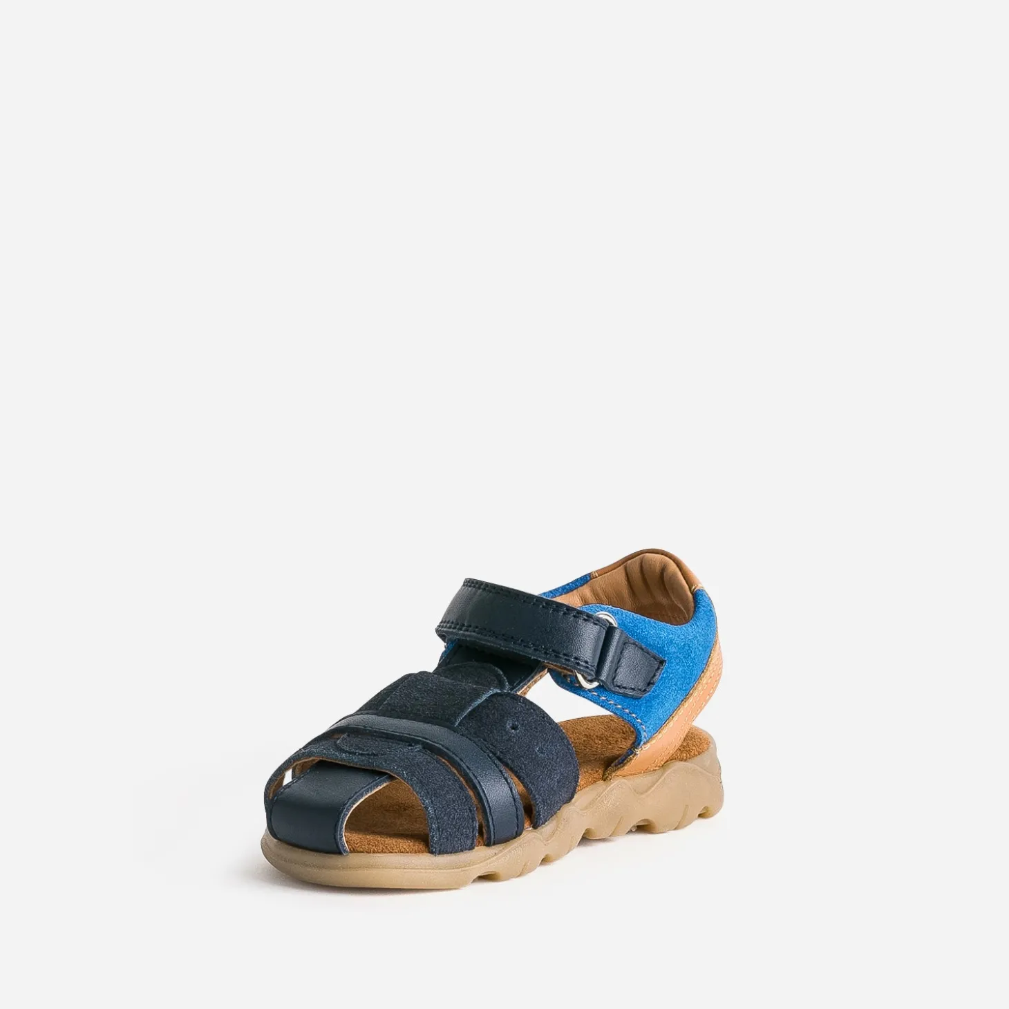 Les notions de confort et de protection sont inhérentes à la sandale pour petit garçon. La preuve avec ce modèle alliant cuir velours et cuir lisse, formé de multiples brides jusqu’au bout du pied. La semelle intérieure accueille le pied en douceur, grâce au cuir velours, la fermeture par scratch participe à l’autonomie des plus petits. Bleu marine, bleu vif et camel, elle s’accorde facilement aux tenues de saison.