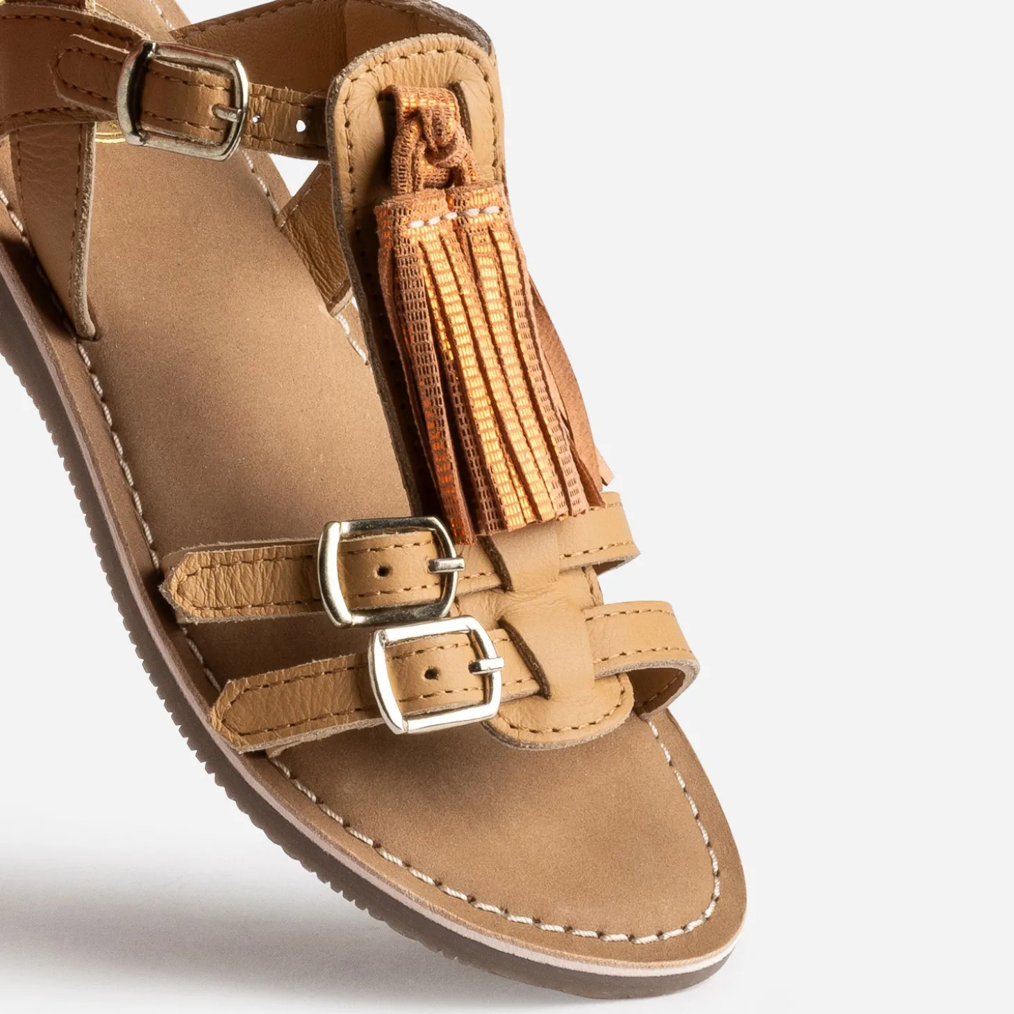 La sandale marron clair en cuir mise sur son élégance innée. La bride en T peut se décorer, ou pas, d’une longue pampille en cuir beige doré, rose ou turquoise avec touches métallisées, pour matcher avec ses tenues préférées.