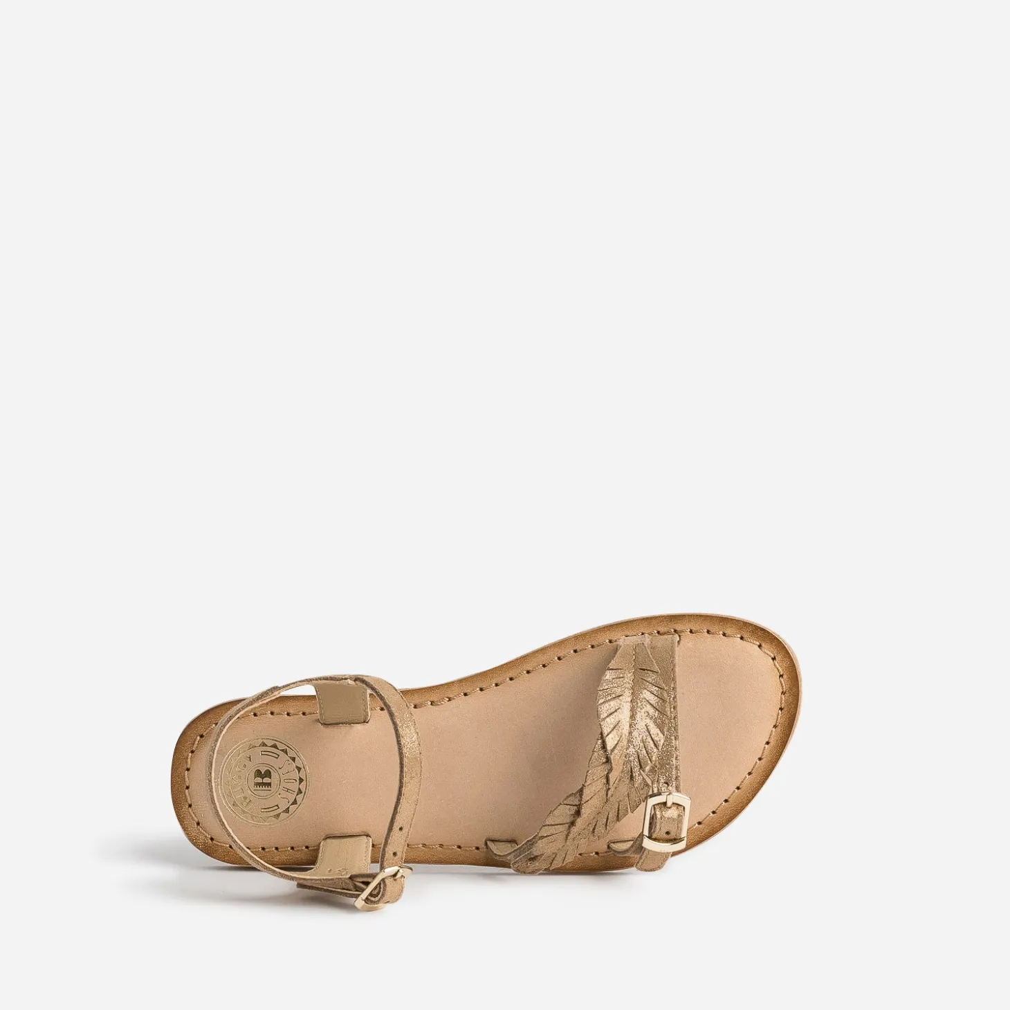 En cuir velours marron, avec finition irisée, cette sandale fille apporte une touche d’élégance aux tenues. Construite avec 3 brides, elle est décorée d’une plume sur le dessus. Elle se ferme par boucles, à ajuster en fonction de la largeur du pied.