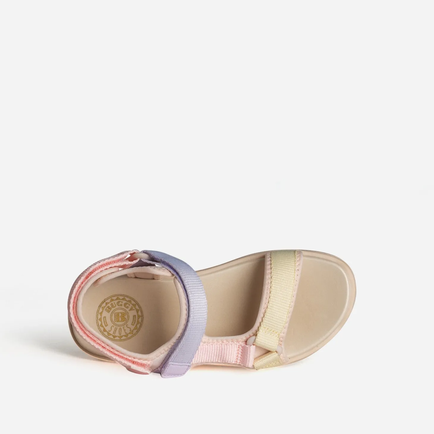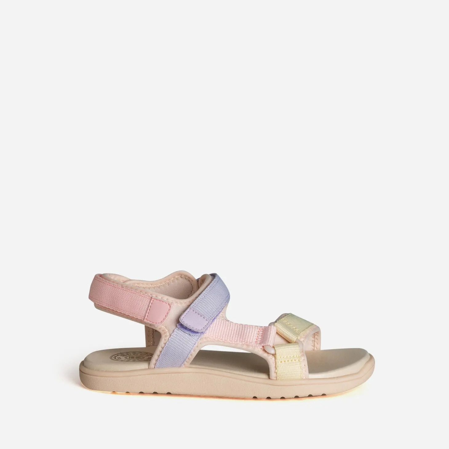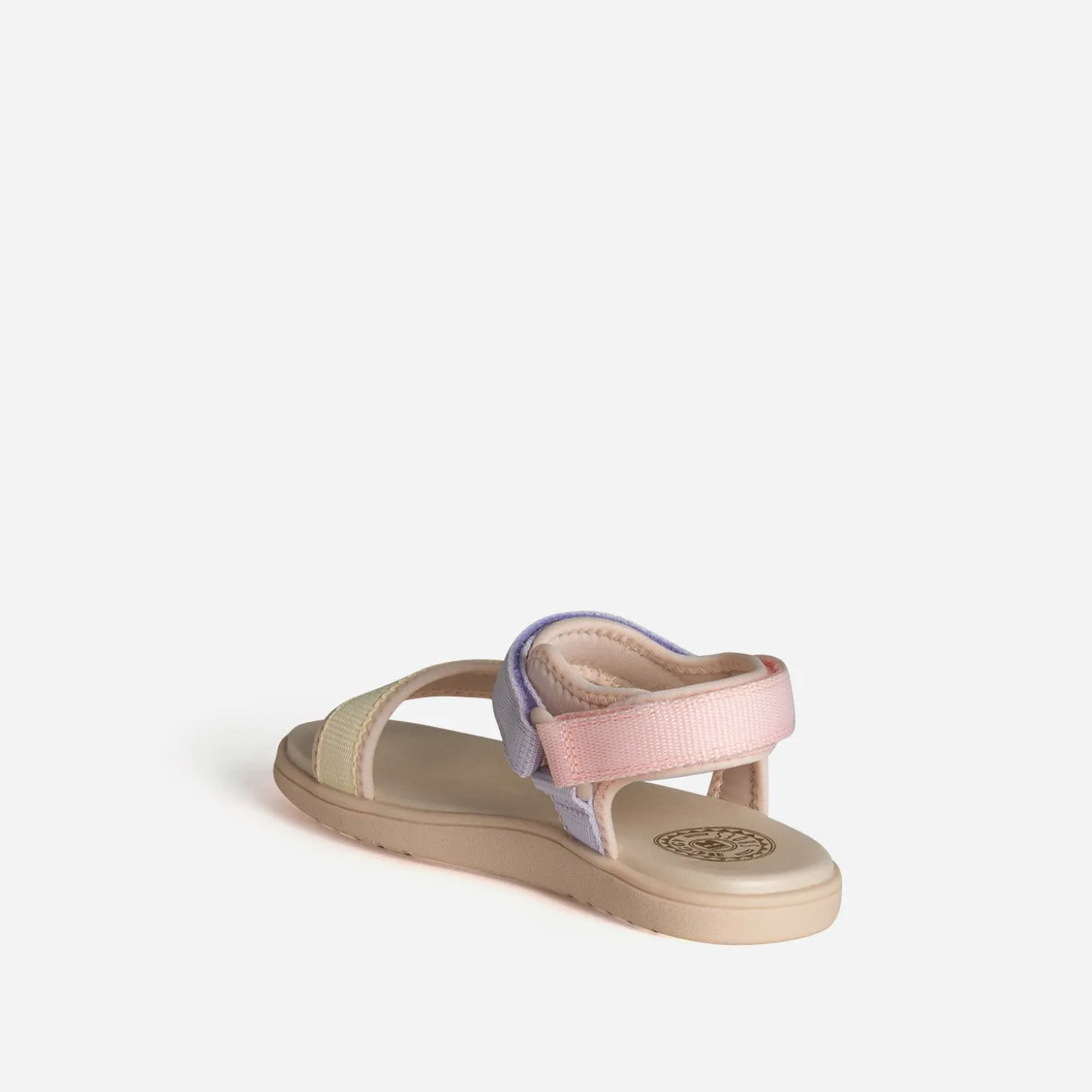 La sandale pour enfant se réinvente pour offrir un maximum de confort aux petits pieds. Par une matière textile souple, par des brides ajustables par scratchs, par une semelle moussée. Les galons se déclinent en couleur pastel, rose, parme et jaune clair, sur fond beige. Un modèle inspiré du sport, pour poursuivre leurs aventures bien chaussés, tout au long de l’été.