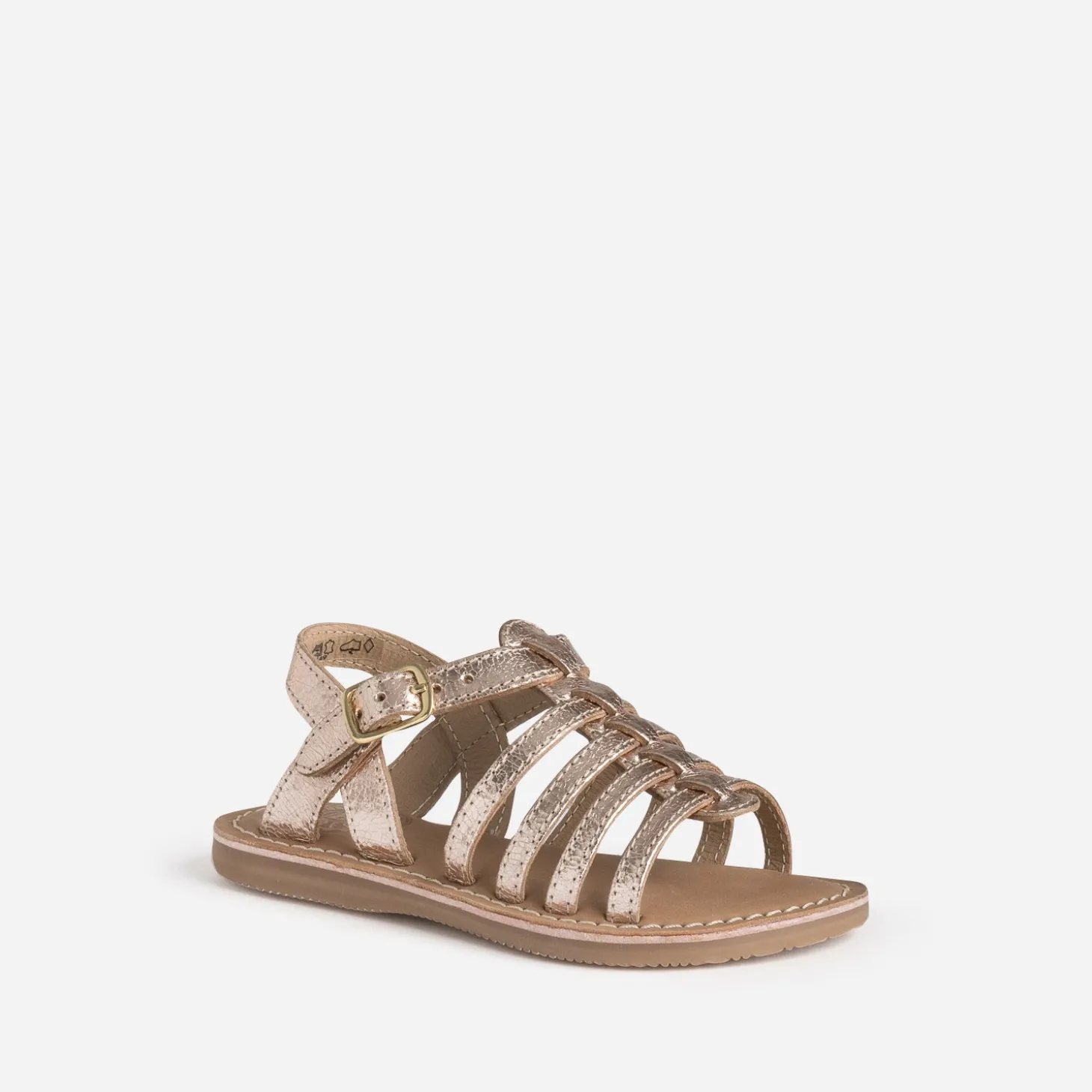 Cette sandale pour petite fille séduit par son jeu de multi brides. En cuir froissé métallisé, elle se décline en coloris rose cuivré. Un modèle intemporel, idéal avec toutes ses tenues d’été.