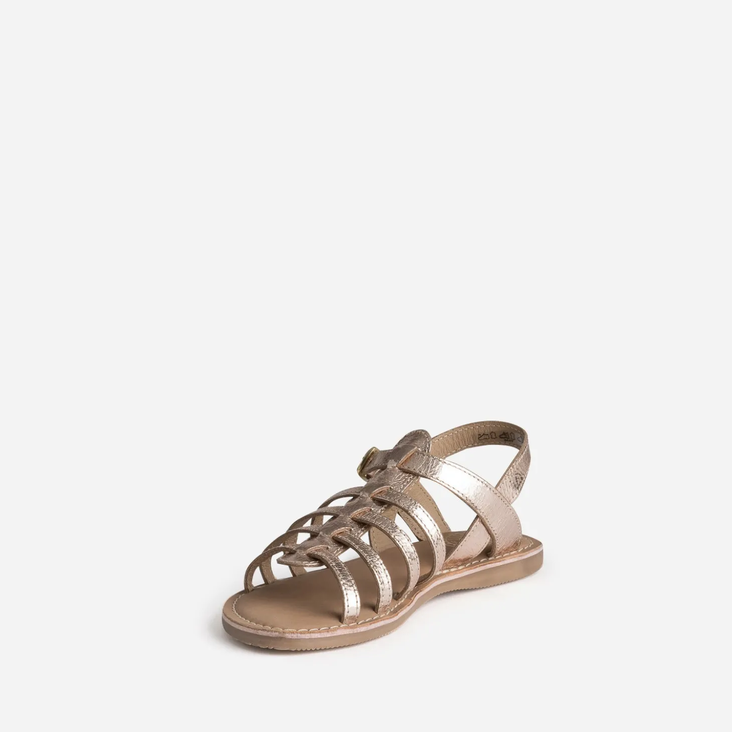 Cette sandale pour fille séduit par son jeu de multi brides. En cuir froissé métallisé, elle se décline en coloris rose cuivré. Un modèle intemporel, idéal avec toutes ses tenues d’été.