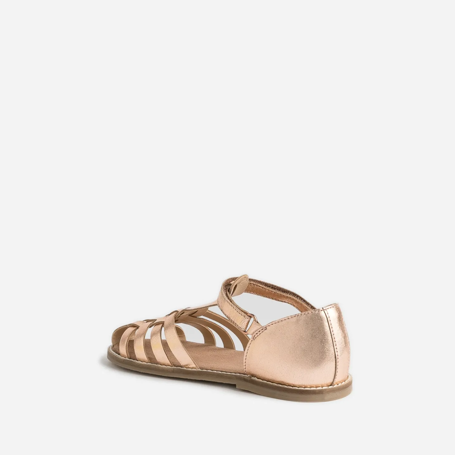 Nouvelle saison estivale, nouveau modèle de sandale pour fille. Confectionnée en cuir, elle se décline en coloris rose cuivré et se démarque par un jeu de brides tressées sur le dessus du pied ; un pied parfaitement maintenu, grâce au contrefort arrière et une fermeture par scratch. Avec un tee-shirt à manches ballon et un short en jean pour le quotidien, avec une robe en tulle pour une cérémonie, elle s’adapte à l’infini.