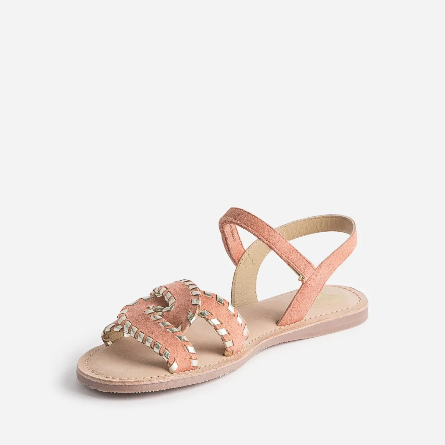Cette sandale junior fille séduit par le cuir velours et le coloris rose saumon, par les brides croisées sur le dessus du pied et le tressage doré. Elle se ferme par un scratch, à ajuster en fonction du cou-de-pied. A associer avec des teintes pastel, amande, jaune ou ciel.