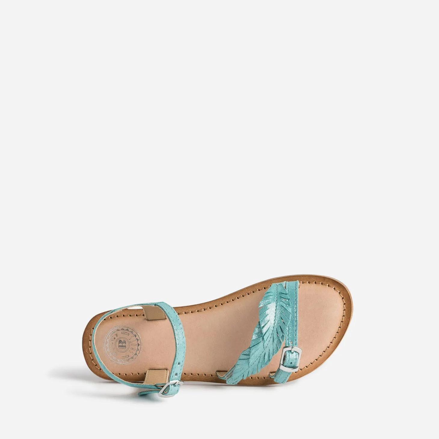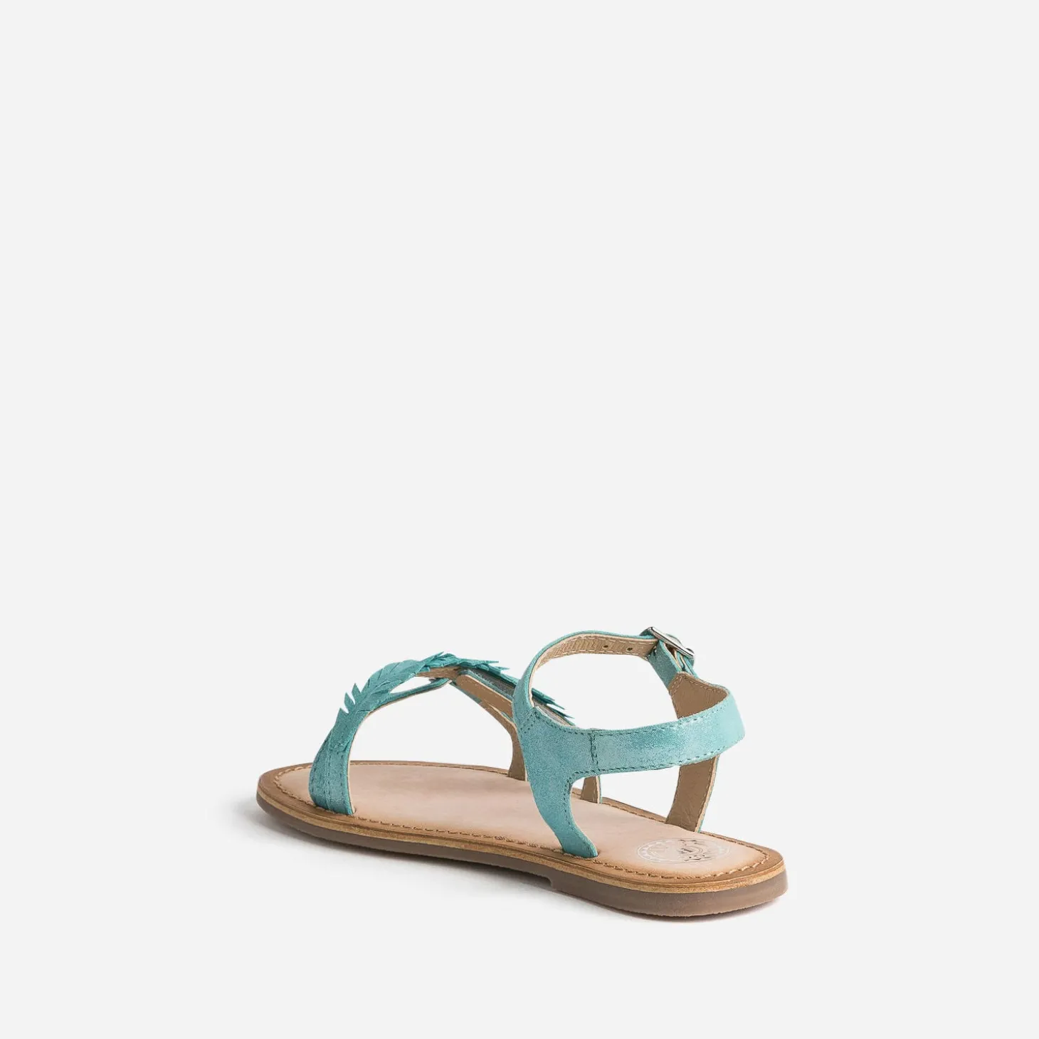 En cuir velours turquoise, avec finition irisée, cette sandale fille apporte une touche de couleur aux tenues. Construite avec 3 brides, elle est décorée d’une plume sur le dessus. Elle se ferme par boucles, à ajuster en fonction de la largeur du pied.