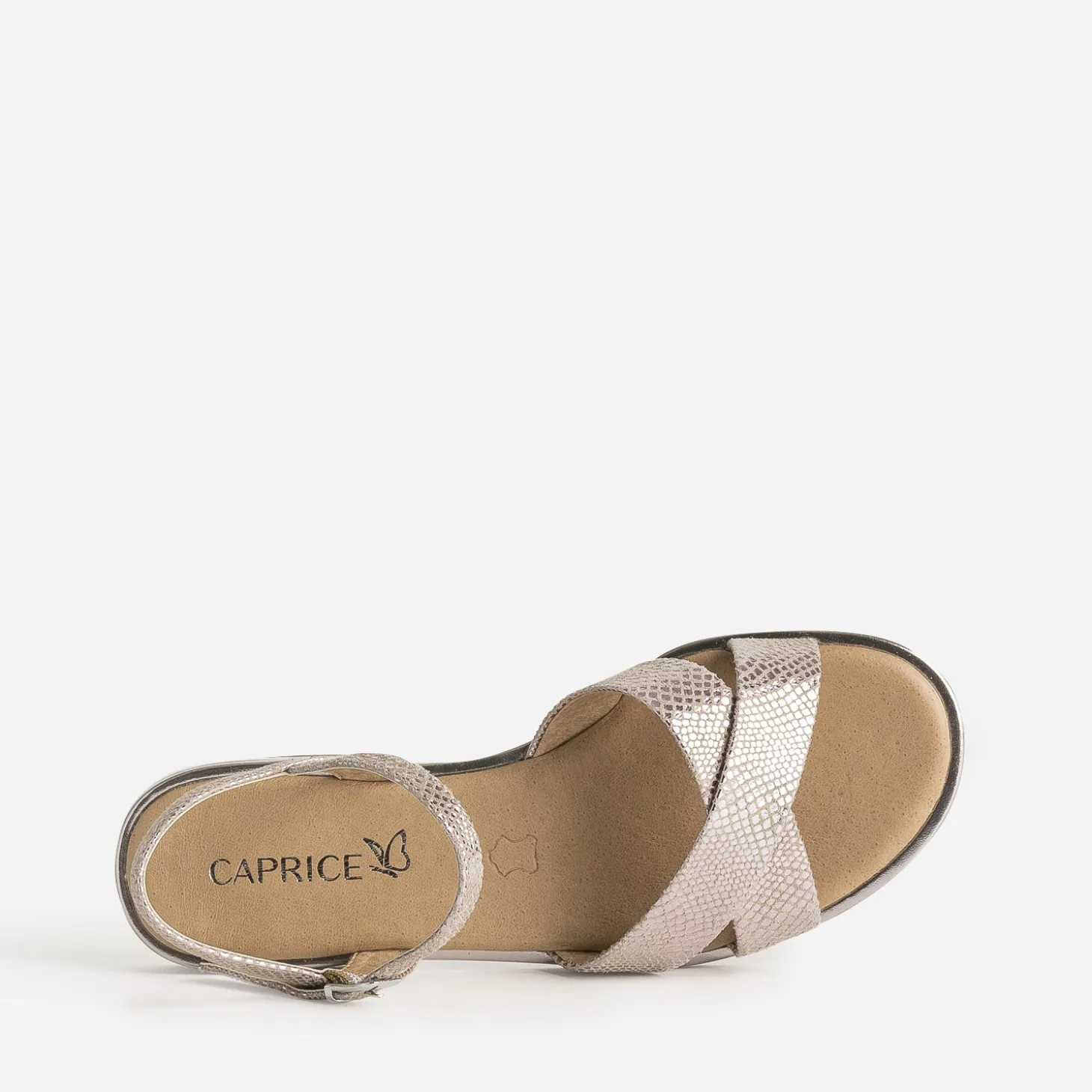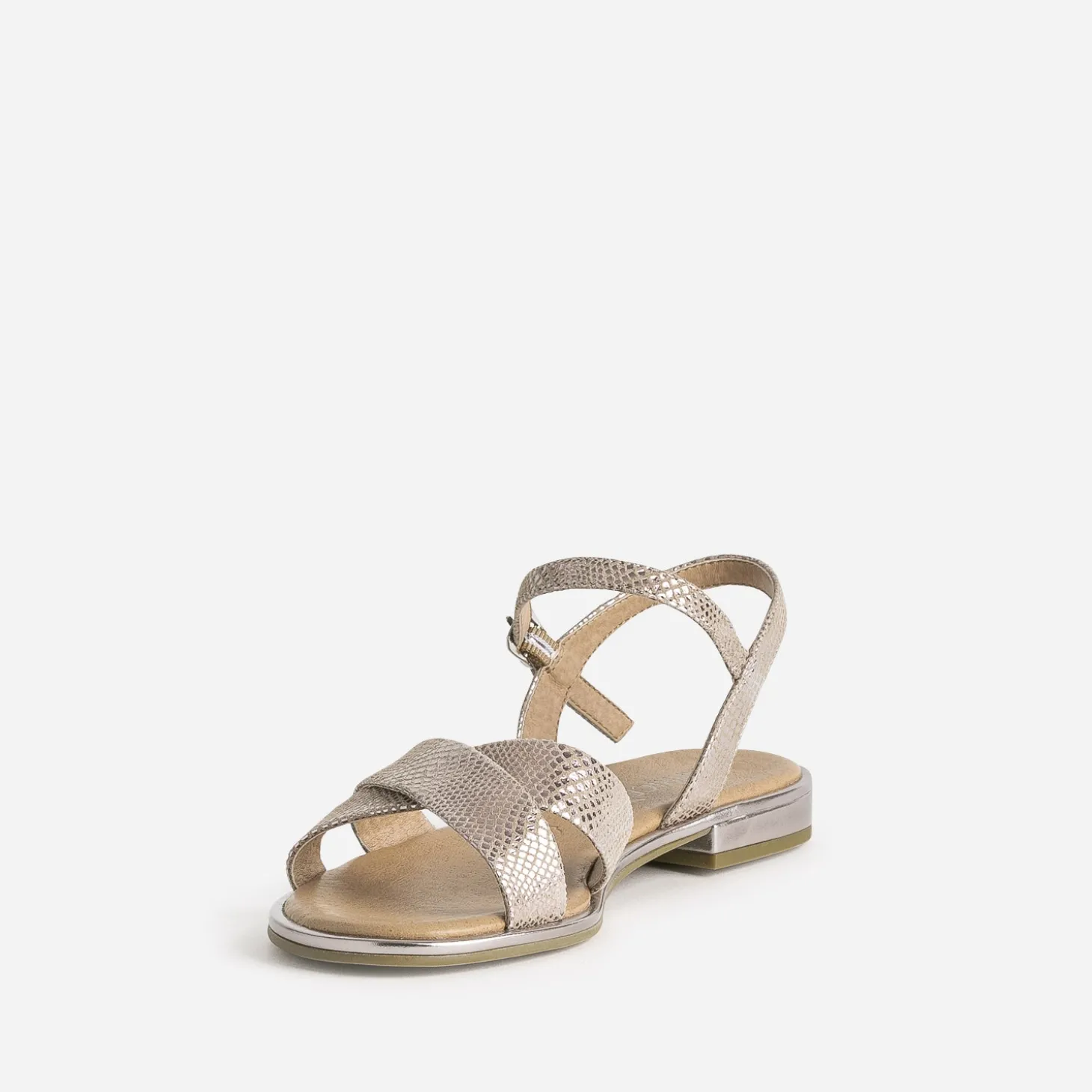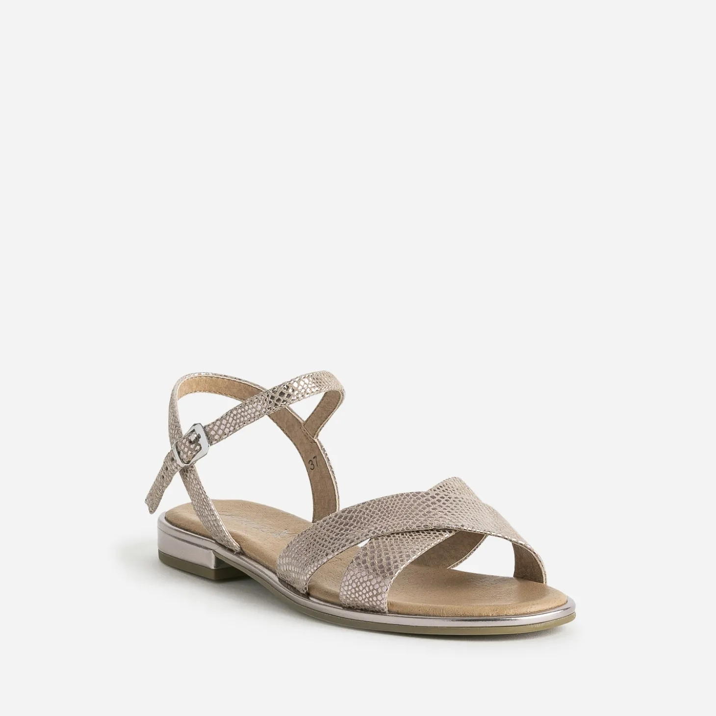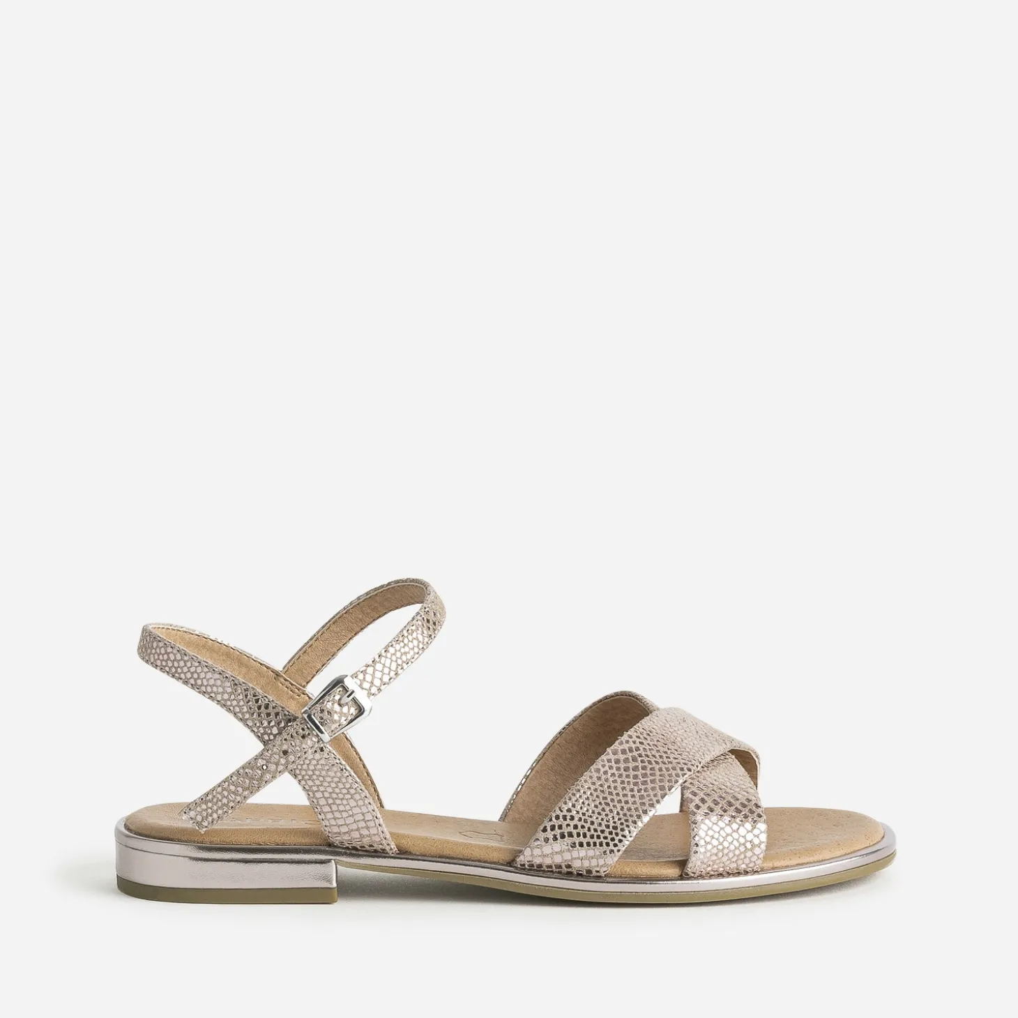 A l’heure où les beaux jours et la chaleur reviennent, faites l’expérience d’une sandale qui sublime et soulage le pied. Une fine bride autour de la cheville, deux larges brides croisées au-dessus du pied, elle présente une doublure cuir et une première moussée. Un modèle décliné en coloris doré avec effet python verni, qui sublime instantanément vos tenues.