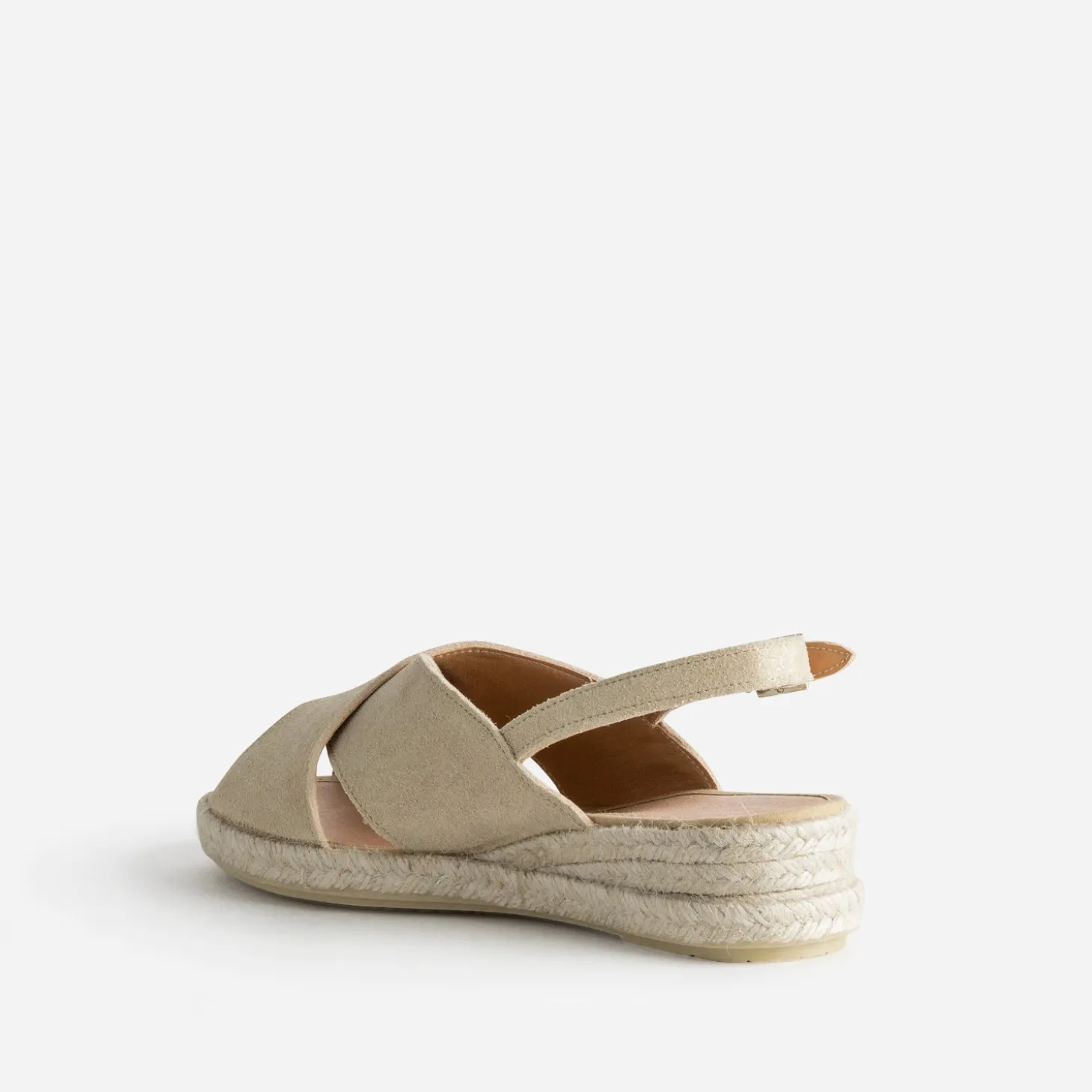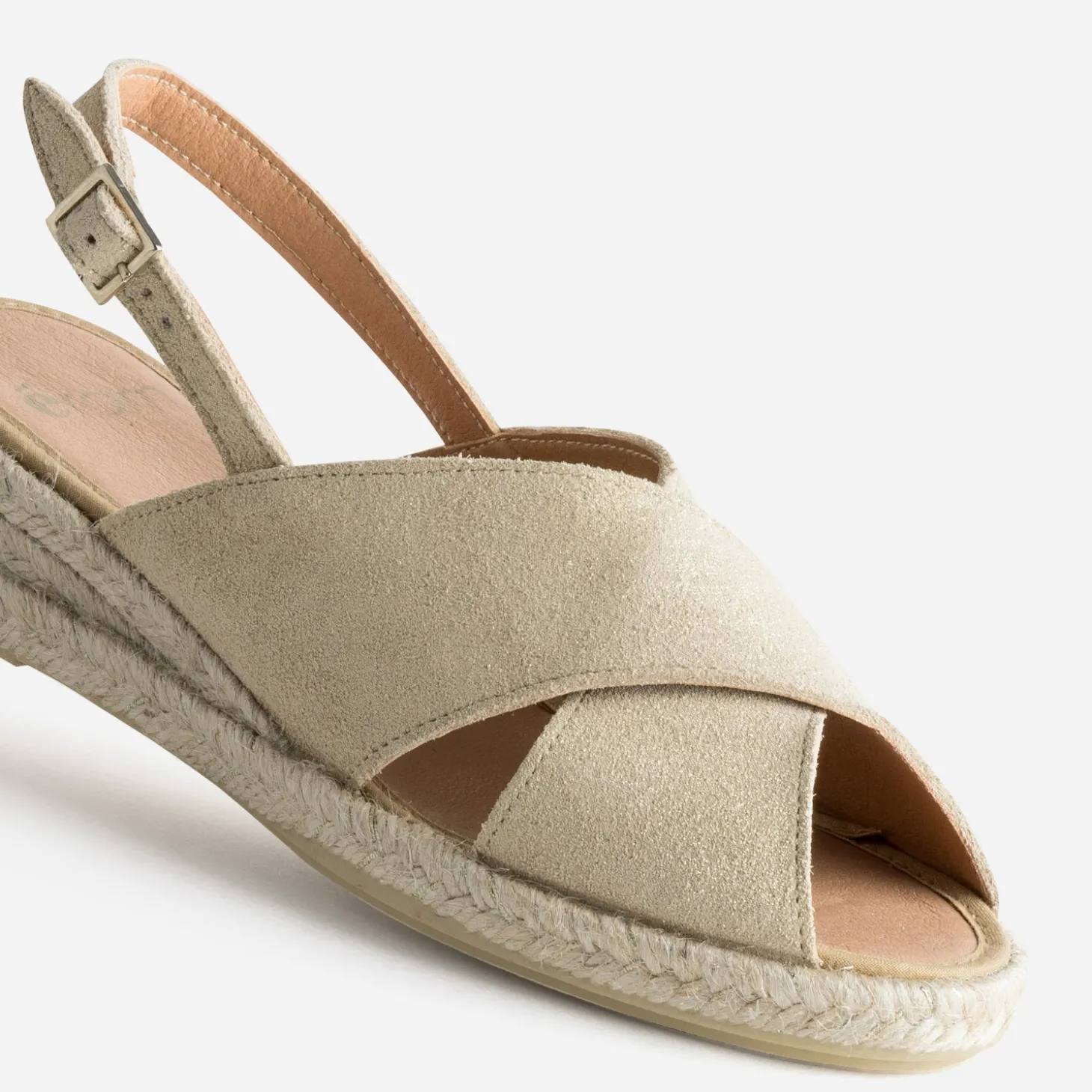L’espadrille, symbole de confort et de simplicité, se réinvente dans une version plus féminine. Cette sandale en cuir velours beige à finition pailletée dorée offre une allure décontractée. La semelle corde légèrement compensée, les larges brides croisées et la bride cheville assurent un maintien parfait. Un modèle à privilégier avec une robe courte en jean souple et un panier en guise de sac à main.