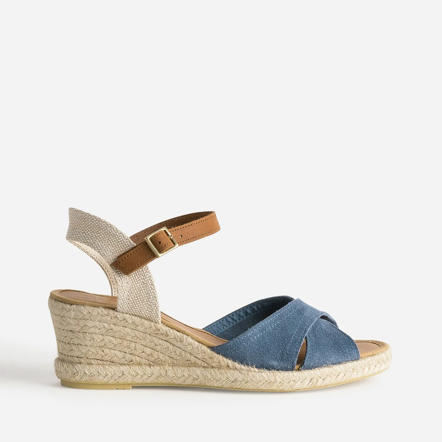 L’espadrille compensée est un modèle idéal pour le changement de saison. Portée pieds nus, elle maintient le pied par deux brides croisées en cuir velours bleu marine. Le talon de 6 cm est entièrement recouvert de corde naturelle, et une bride camel vient maintenir la cheville. Abusez-en dès le printemps, avec du camel et du denim brut.
